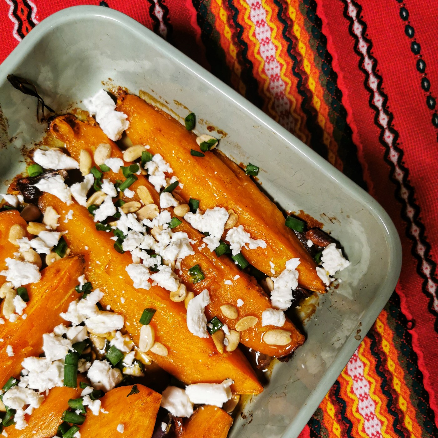 Bataty odkryte na nowo - polane limonkowym dressingiem, ze słonawą fetą i chrupiącymi orzeszkami ziemnymi. Co będzie potrzebne: 2 duże bataty 1 czerwona cebula 1 łyżeczka wędzonej papryki 2 łyżeczki soli morskiej 2 łyżki oliwy Starta skórka z limonki Sok... Continue Reading →