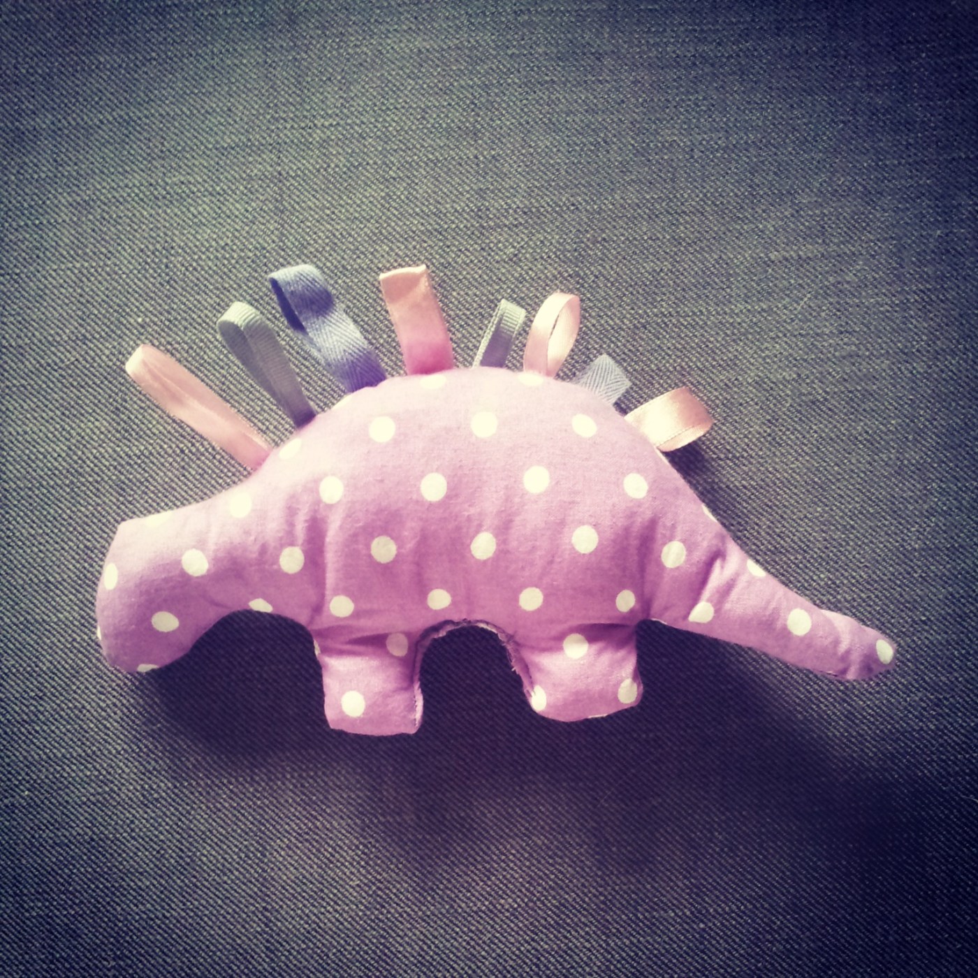 Moja pierwsza zabawka dla małej to dinozaur z ulubionymi przez dzieci tasiemkami. Wypchany wsadem z poduszki i szeleszczącą folią. Nie obyło się niestety bez wpadki, bo wybrałam najgorsze miejsce do przewijania na prawą stronę i zaszywania – brzuch między nogami, gdzie ciężko operować maszyną, ale przecież najlepiej się człowiek uczy na błędach 😉 Łucja doceniła urok przytulanki zrobionej przez mamę i szalała zadowolona po dywanie 🙂