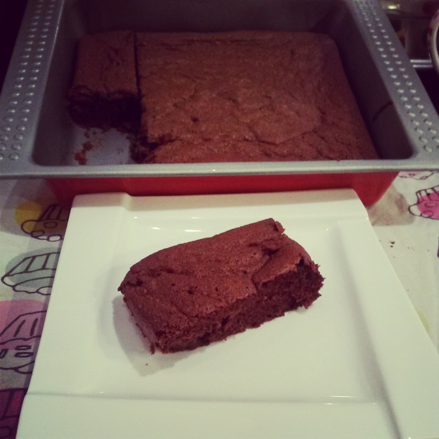 Masło rozpuścić z czekoladą na małym ogniu, przestudzić. Ubić jajka z cukrem na puszystą masę, dodać mąkę i masło z czekolady. Piec w piekarniku nagrzanym do 150°C przez 15 minut. Blaszka okrągła o średnicy maks 20 cm, ja użyłam kwadratowej o boku 20 cm.