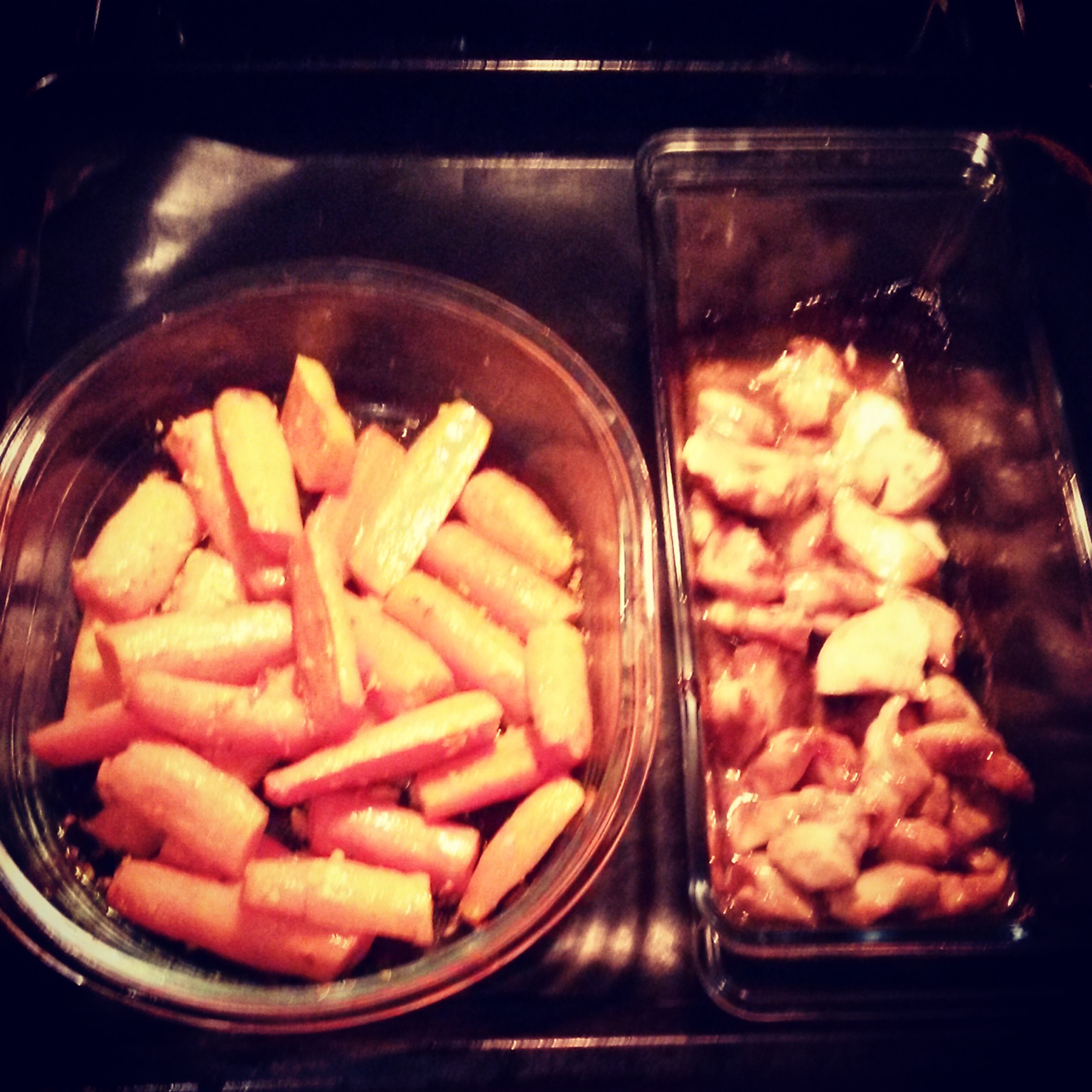 Imbir, 2 ząbki czosnku i chilli drobno posiekać, dodać kurkumę i rozpuszczone masło lub olej kokosowy. Marchewki obrać i pokroić na mniejsze kawałki, polać marynatą. Przygotować marynatę do mięsa: ząbek czosnku wycisnąć, wymieszać z łyżką miodu, sosem sojowym i olejem sezamowym. Piersi pokroić na ok 3 cm kawałki, wrzucić do marynaty. Nagrzać piekarnik do 170°C, wstawić marchewkę w naczyniu żaroodpornym przykrytym folią aluminiową na 45 minut. Mięso wstawiamy na 30 minut czyli 15 minut później niż marchew. Pod koniec pieczenia do marchewki dodać łyżkę miodu i wymieszać.