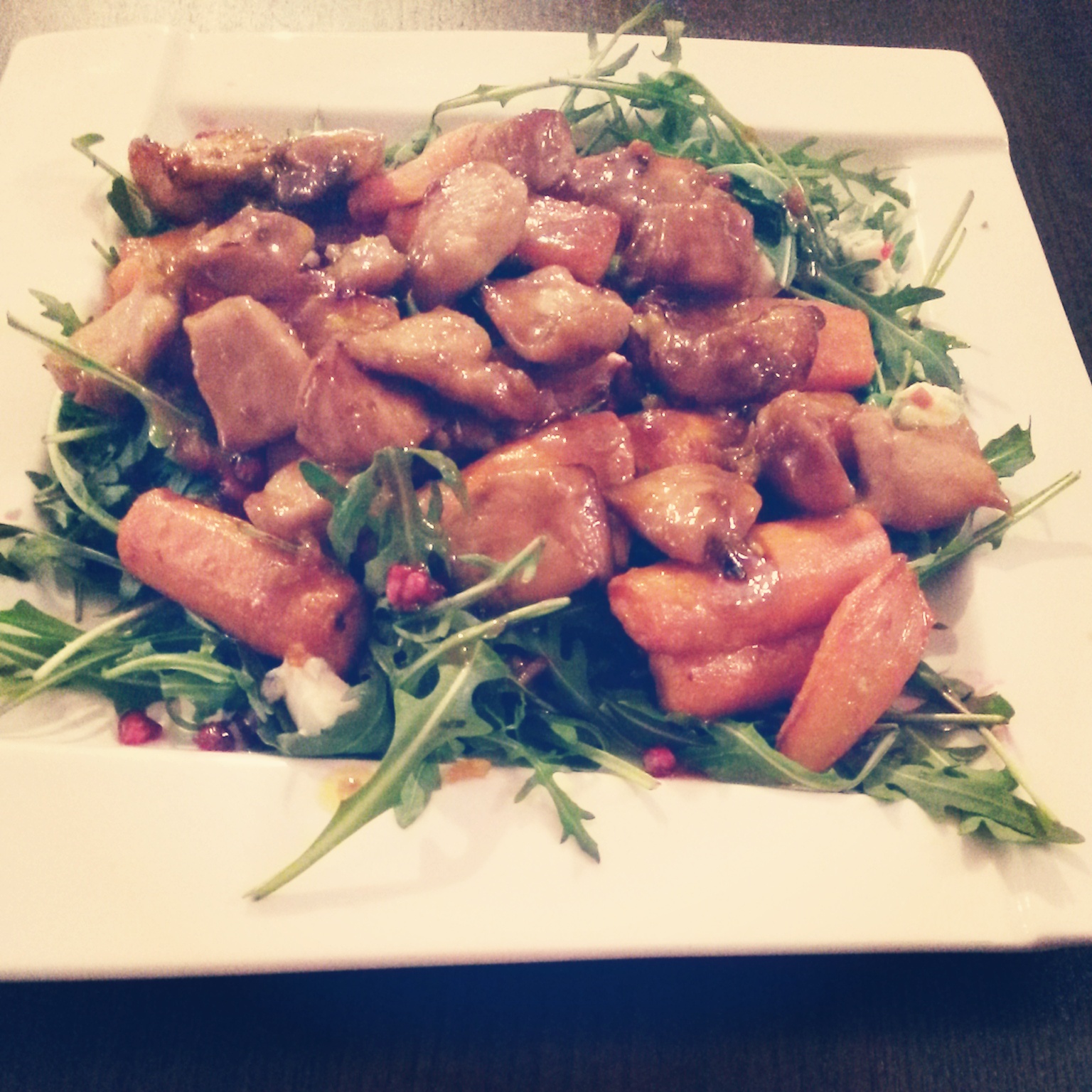 Na talerze wyłożyć rukolę, posypać nasionami granatu i pokrojoną gorgonzolą. Na wierzch układać upieczoną marchewkę i kurczaka. Z dna obu naczyń zebrać resztki marynaty, dodać sok z cytryny i oliwę i wymieszać. Polać sałatkę, podawać póki ciepła 😉