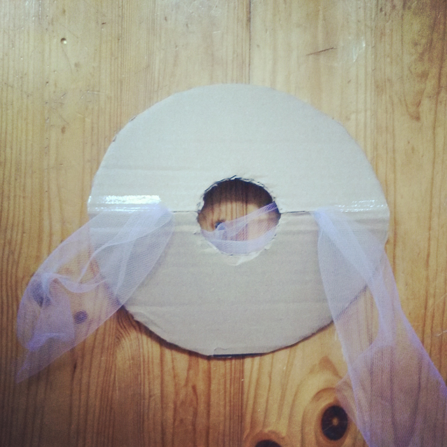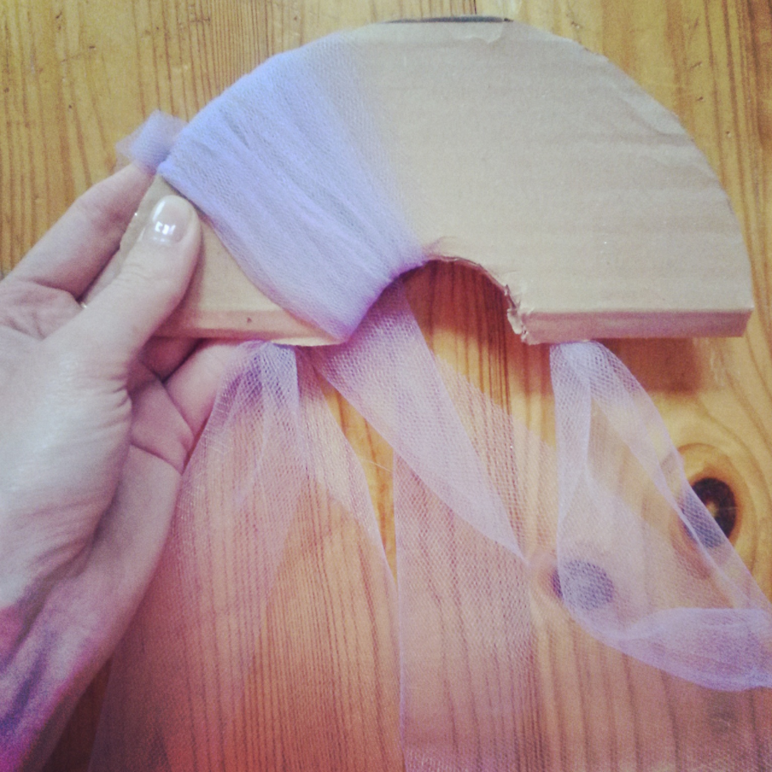 Krok 5: nawijamy tiul na złożony na pół szablon, miejsce przy miejscu, aż wypełnimy całą powierzchnię (nawet kilka razy)