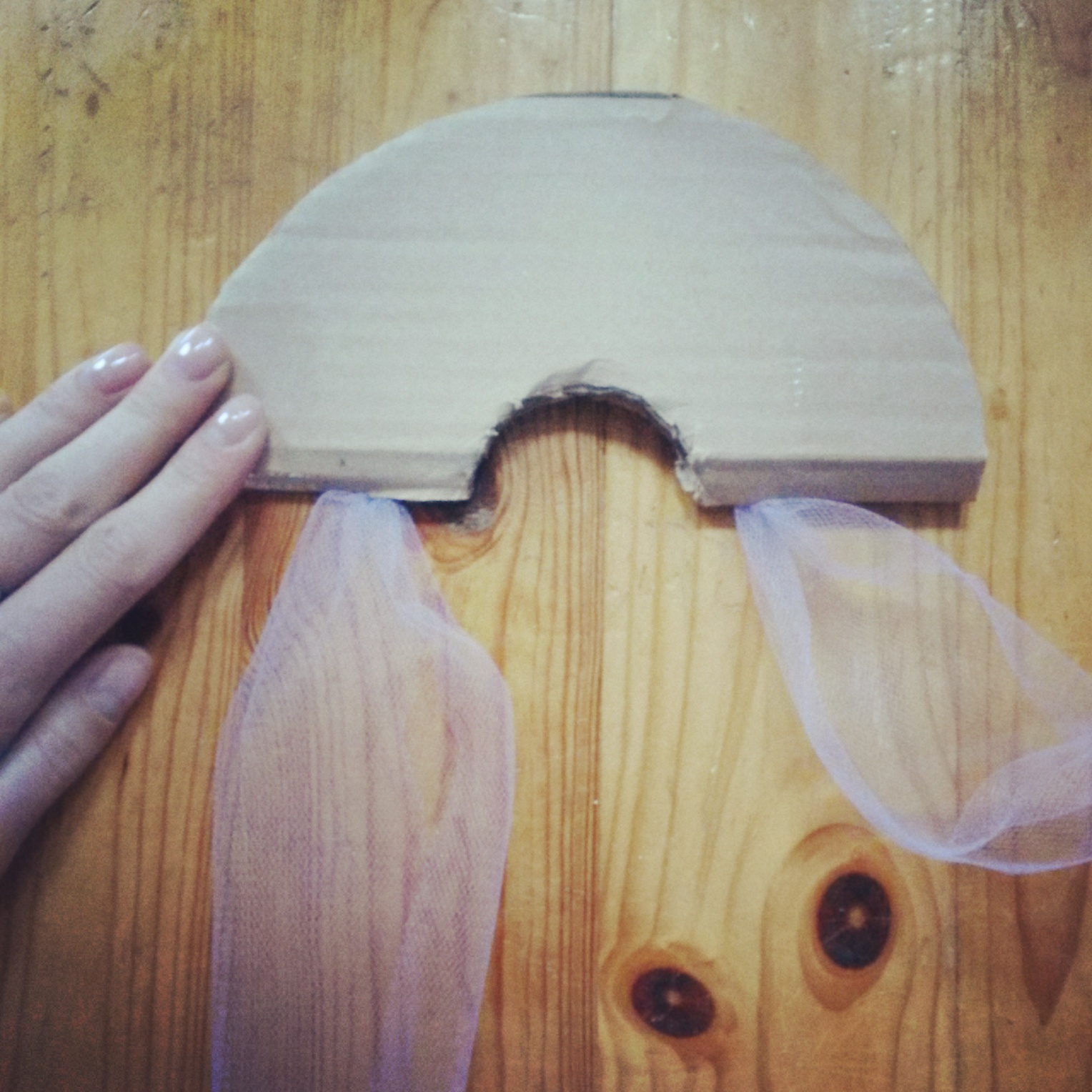 Krok 4: zahaczamy od tyłu w nacięciach ok 20 cm kawałek tiulu – będzie potrzebny do związania pomponu