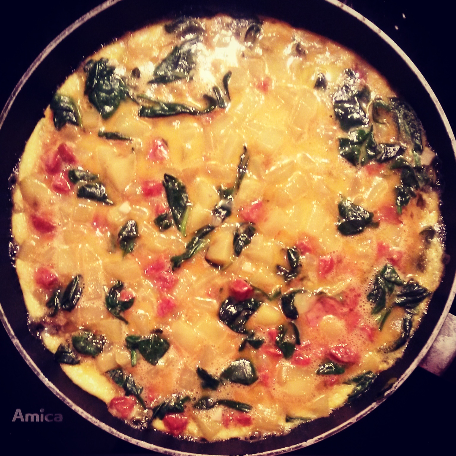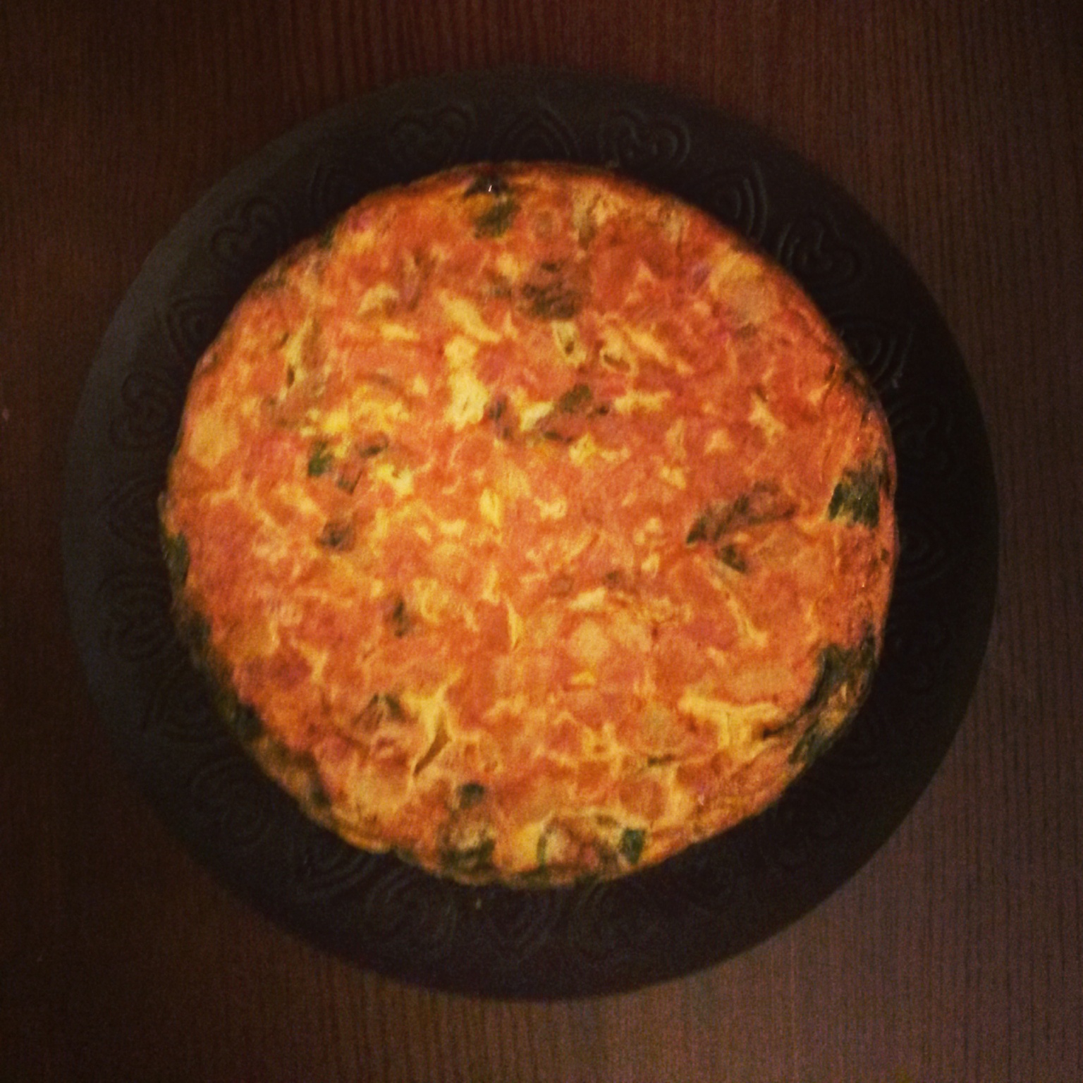 Pyszny omlet hiszpański, którego bazą są ziemniaki, cebula i jaja. U mnie z dodatkiem pikantnego chorizo i szpinakiem. Szybkie i sycące danie, tzw. jednogarnkowe (wszystko robimy na jednej patelni).