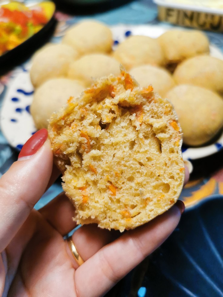 Delikatne bułeczki bez dodatku jajek i nabiału. U mnie z dwoma rodzajami mąki – orkiszową i żytnią razową. Z podanej ilości ciasta wyjdzie 12 normalnej wielkości bułek lub 24 małe bułeczki, które są idealne do różnych sosów i dipów (np.tapenada, dip z sera pleśniowego, hummus, guacamole).