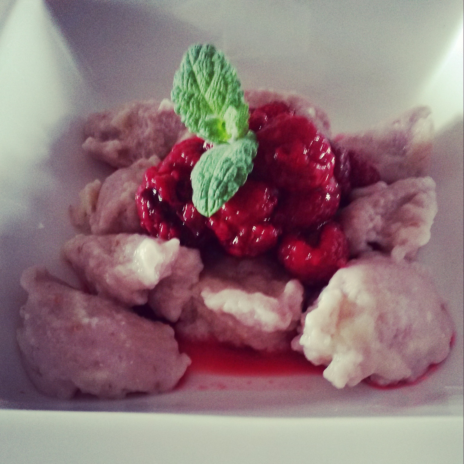 Jeśli iść na łatwiznę to po całości 🙂 Ekspresowe kluski leniwe, bez rolowania i krojenia (a więc bez brudzenia stolnicy) , tzw.kluski kładzione. Mega pomocny jest malakser, do którego wrzucamy wszystkie składniki, ale spokojnie można wyrobić ciasto ręcznie. Do ciasta dorzuciłam maliny, dzięki którym uzyskałam ładny kolor (można kombinować z innymi owocami).