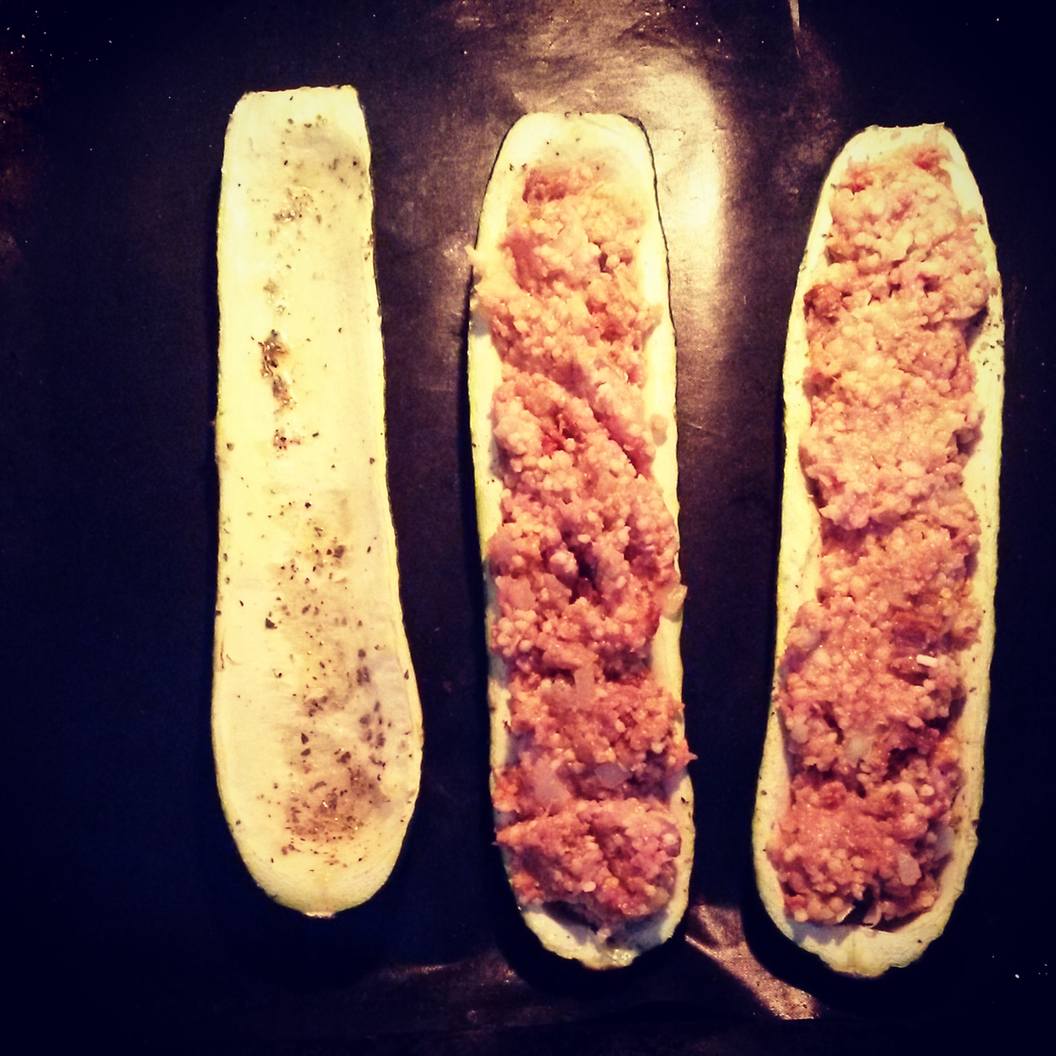 Cukinie przekroić wzdłuż na pół, usunąć gniazda nasienne (wyrzucić), po czym wydrążyć miąższ, żeby było jak najwięcej miejsca na farsz. Posmarować oliwą, posypać oregano, solą i pieprzem i wstawić do piekarnika nagrzanego do 180°C na 15 minut (rozcięciem do góry).