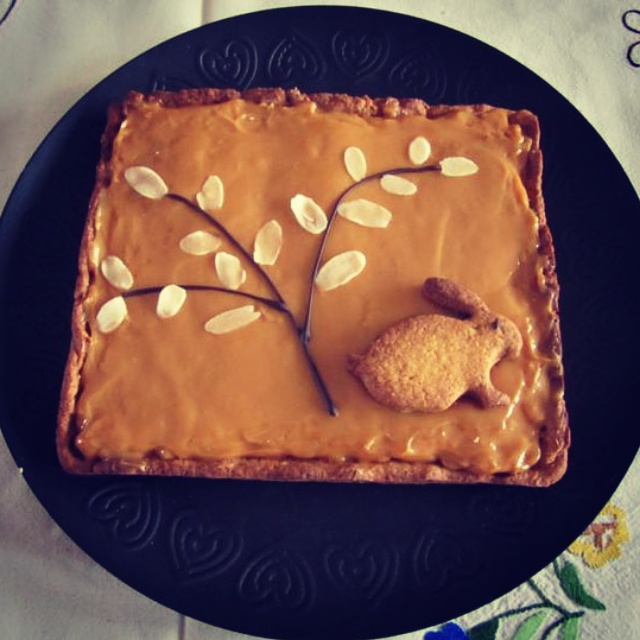 Na wystudzone ciasto nałożyć i rozsmarować konfiturę z porzeczki, a na wierzch masę kajmakową. Dowolnie dekorować (u nnie królik z kruchego ciasta i bazie z czekolady i platków migdałów).