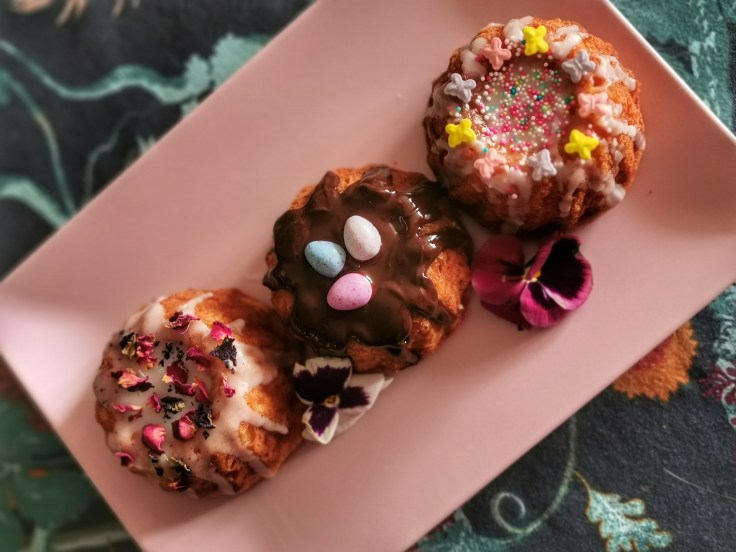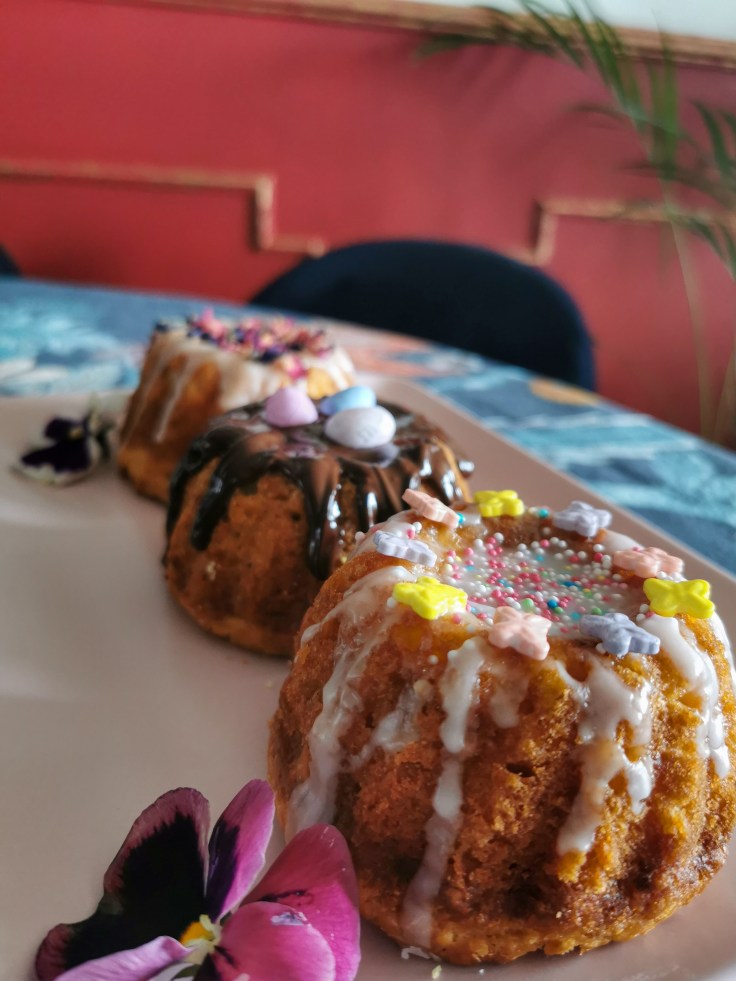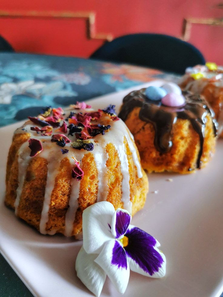 Lekkie i puszyste, o orzeźwiającym cytrynowym smaku. Pięknie wyglądają jako dekoracja stołu wielkanocnego lub w koszyku świątecznym. Moje są ozdobione polewą czekoladową i słodkimi nakrapianymi jajeczkami czekoladowymi, ale świetnie też pasuje zwykły lukier. Przydadzą się foremki do mini babeczek – na rynku pełno jest teraz silikoniwych w wiosenno-wielkanocnych kształtach. Inspiracją był przepis Nigelli, z którego jak zwykle odjęłam połowę cukru 🙂