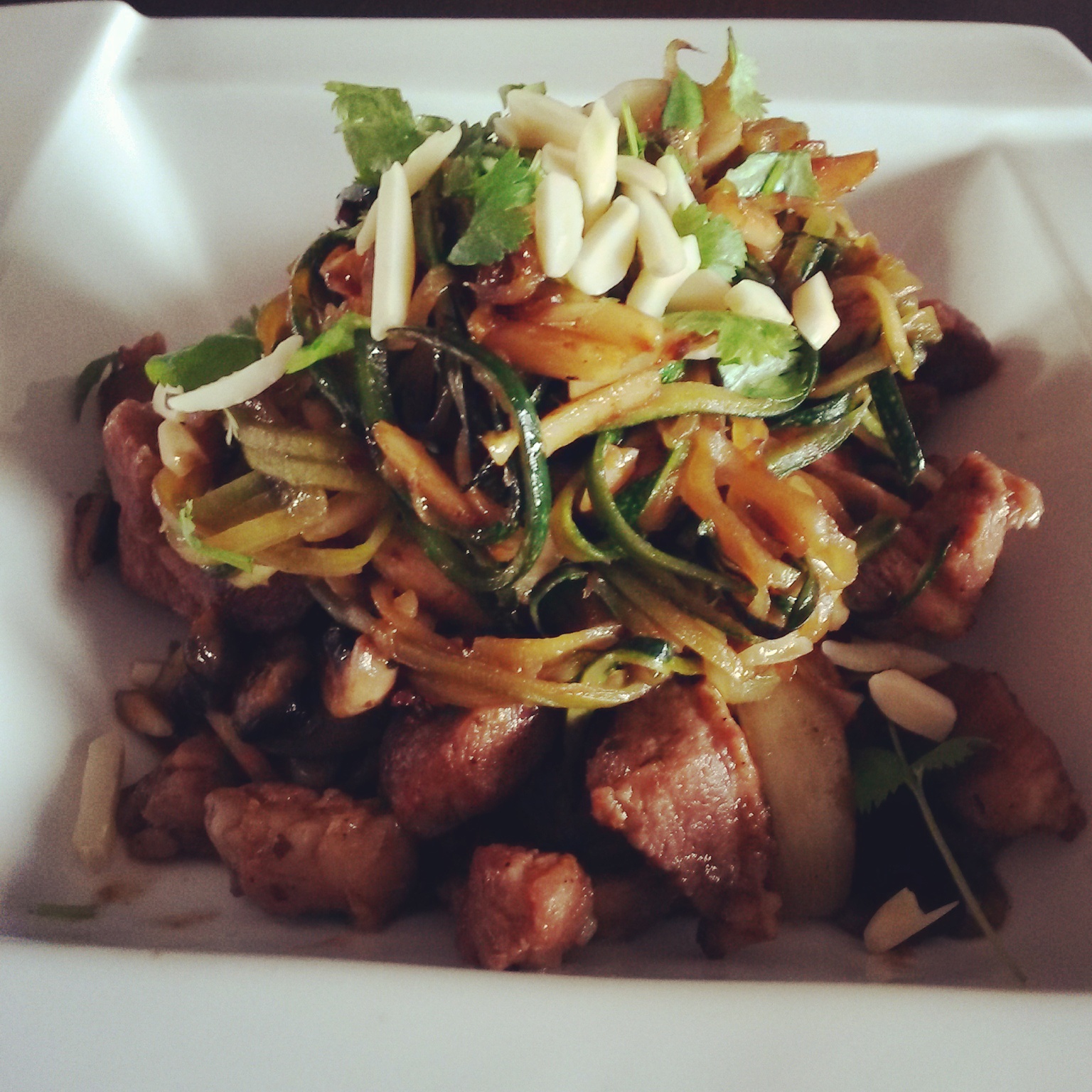 Karkówkę marynować w teriyaki przynajmniej pół godziny. Obieraczką „julienne” kroić cukinię (wraz ze skórą) aż do gniazda nasiennego, które wyrzucamy. Na pateli lub woku rozgrzać olej sezamowy, wrzucić połowę z grubsza posiekanych migdałów, chwilę smażyć, dodać pokrojony na plasterki czosnek i posiekaną chilli. Smażyć aż zaczną intensywnie pachnieć, wrzucić cukiniowe spaghetti i podgrzewać aż zmięknie. Zdjąć z patelni, na którą wlać dodatkową łyżkę oleju i przesmażyć karkówkę pokrojoną w paski. Gdy karkówka będzie już zrobiona, przesunąć ją na bok patelni, a na wolnej powierzchni przesmażyć cebulę pokrojoną na ósemki. Gdy zmięknie dodać łyżkę brązowego cukru i skarmelizować, wymieszać z mięsem i znowu zrobić wolną przestrzeń na patelni przesuwając wszystko na bok. Pieczarki pokroić na plasterki i smażyć aż się zrumienią, polać sosem sojowym i wymieszać z resztą składników na patelni. Dodać cukiniowy makaron i delikatnie wymieszać. Nakładać na talerze, posypać resztą pokrojonych migdałów i posiekaną kolendrą.