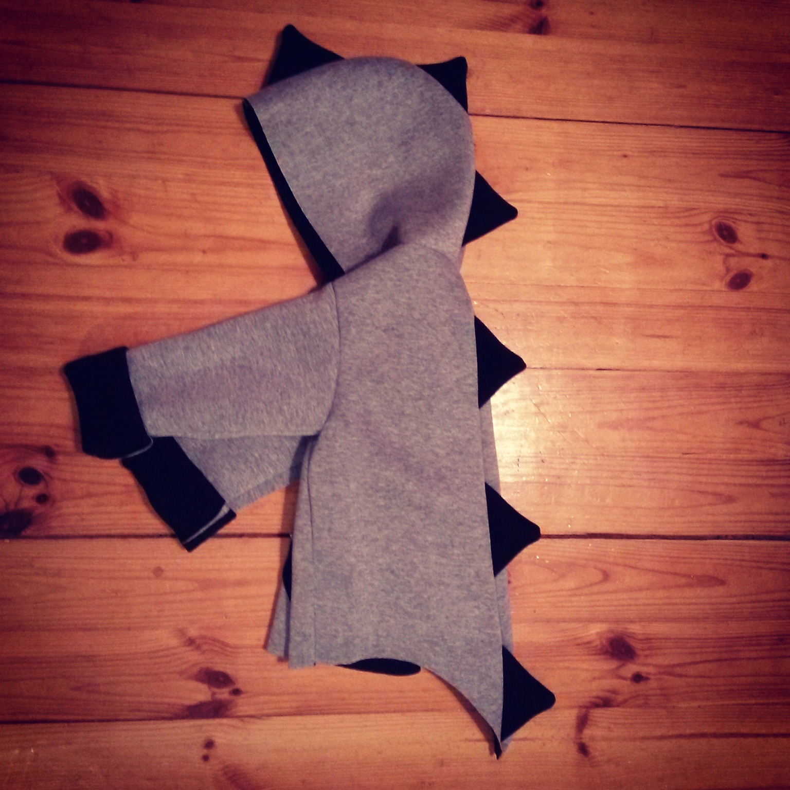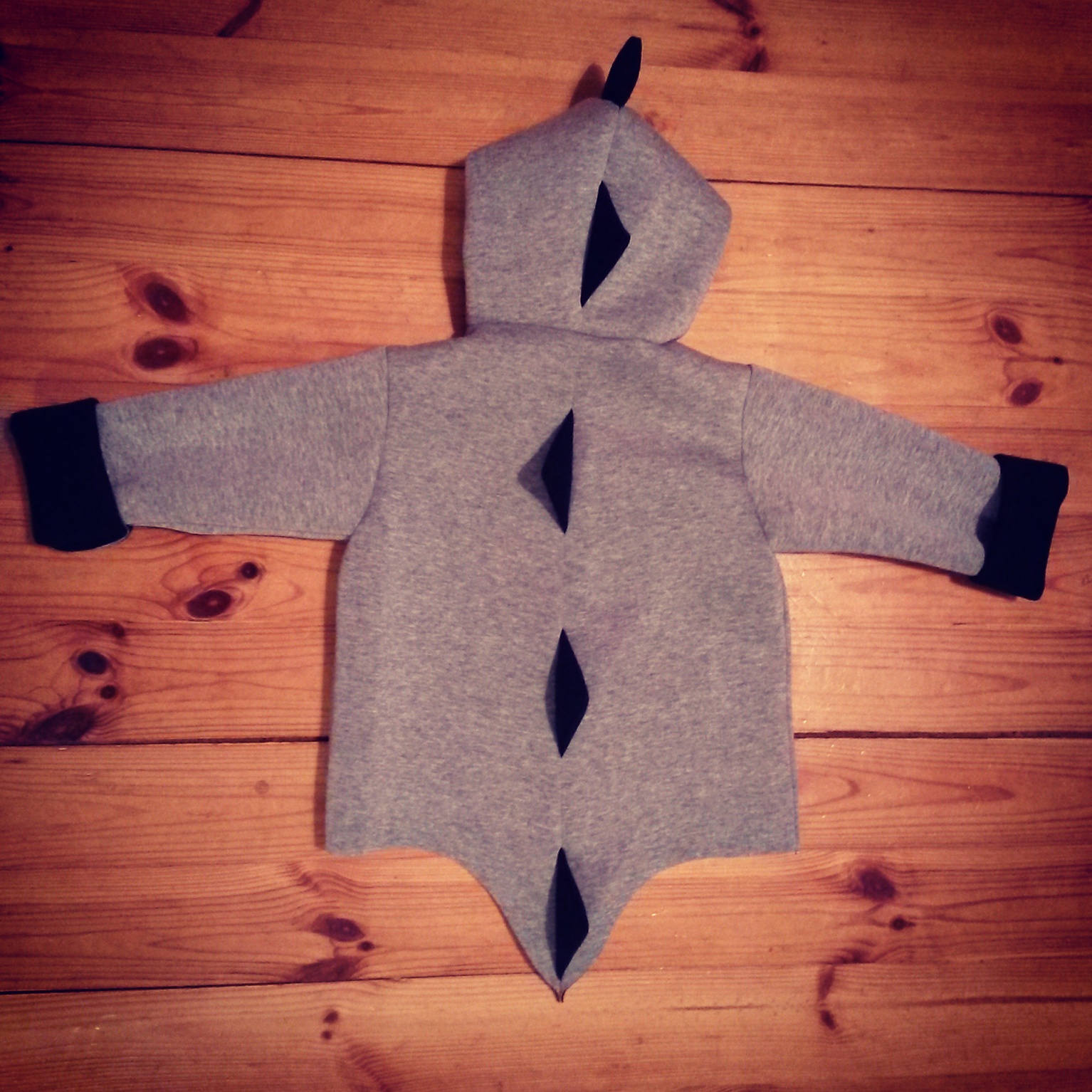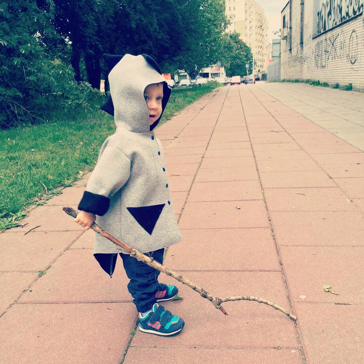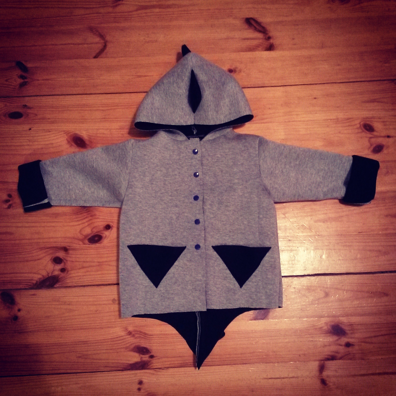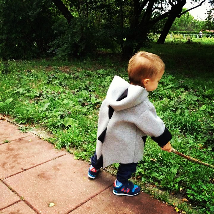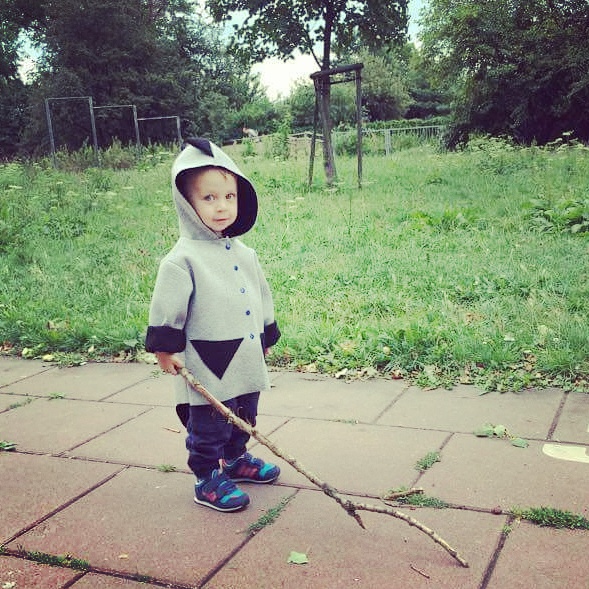 Czas się pochwalić uszytkiem, który powstał jako nagroda w moim wiosennym konkursie – płaszczyk z pianki, ale w wersji dla chłopca. Baza była taka sama jak w płaszczyku, który uszyłam dla Łucji, ale wersja męska zdecydowanie zyskała przez dodanie wypasionych kolców a’la stegozaur na całej długości tyłu (łącznie z ogonem) i na kapturze. Kieszenie, które naszyłam z przodu powtarzają wzór trójkąta. Płaszczyk jest zapinany na plastikowe napy w lekko kontrastowym, granatowym kolorze . Wywijane rękawy mają sporo zapasu więc płaszczyk może dłużej posłużyć maluchowi. Raz jeszcze utwierdziłam się w przekonaniu, że praca z pianką jest bardzo przyjemna 🙂