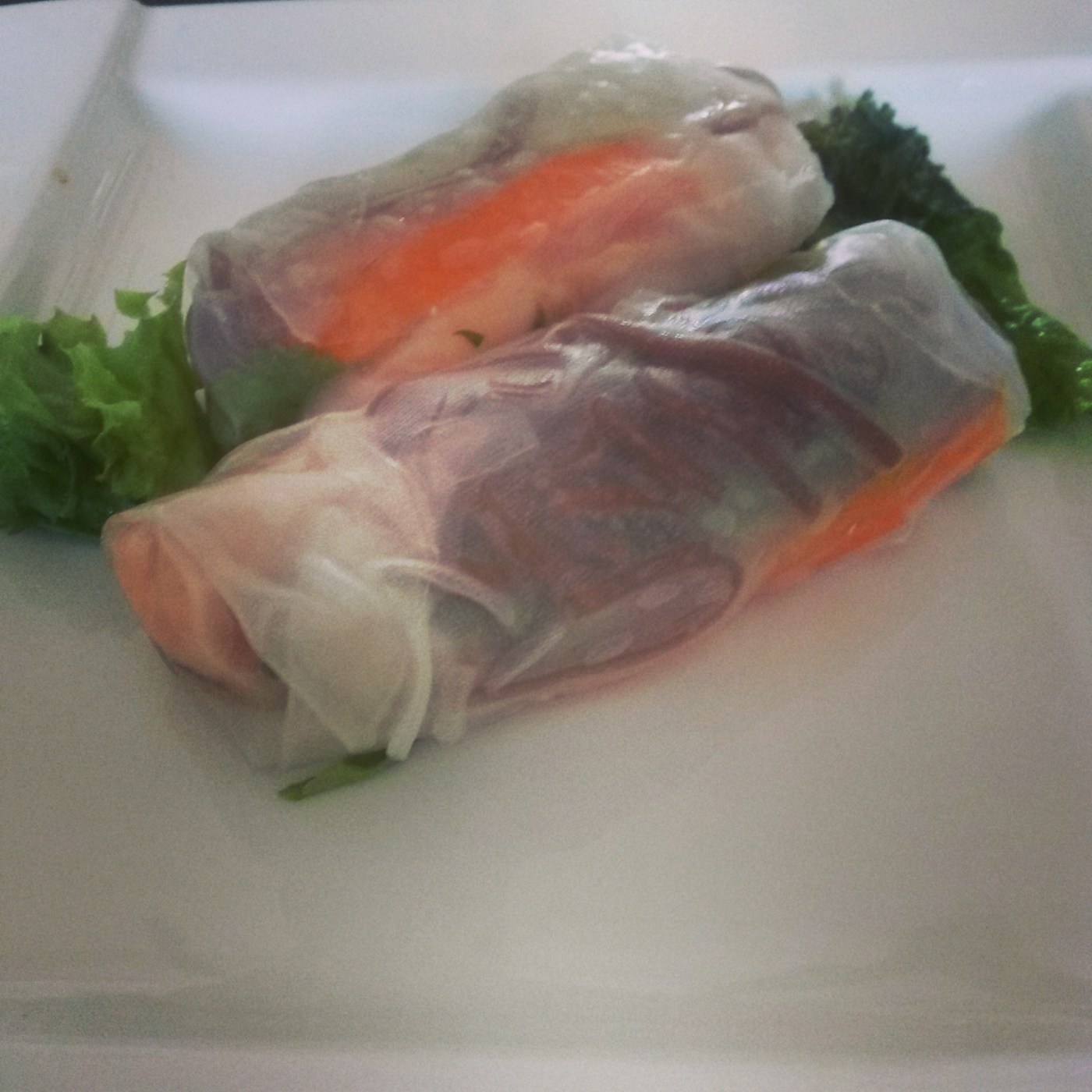 Arkusze ciasta ryżowego moczyć około 45 sekund w zimnej wodzie, odsączyć na ręczniku papierowym i ułożyć na desce (uważajcie, bo ciasto do drewna bardzo się lepi , użyjcie deski szklanej lub plastikowej). Na środek wyłoźyć nadzienie: kawałek łososia, dwa słupki marchewki, sałatę, kilka listków kolendry i makaron. Zawinąć boki do środka po czym zrolować sajgonkę jak krokieta. W czasie nadziewania można namaczać kolejny arkusz – przygotowanie pójdzie naprawdę szybko.