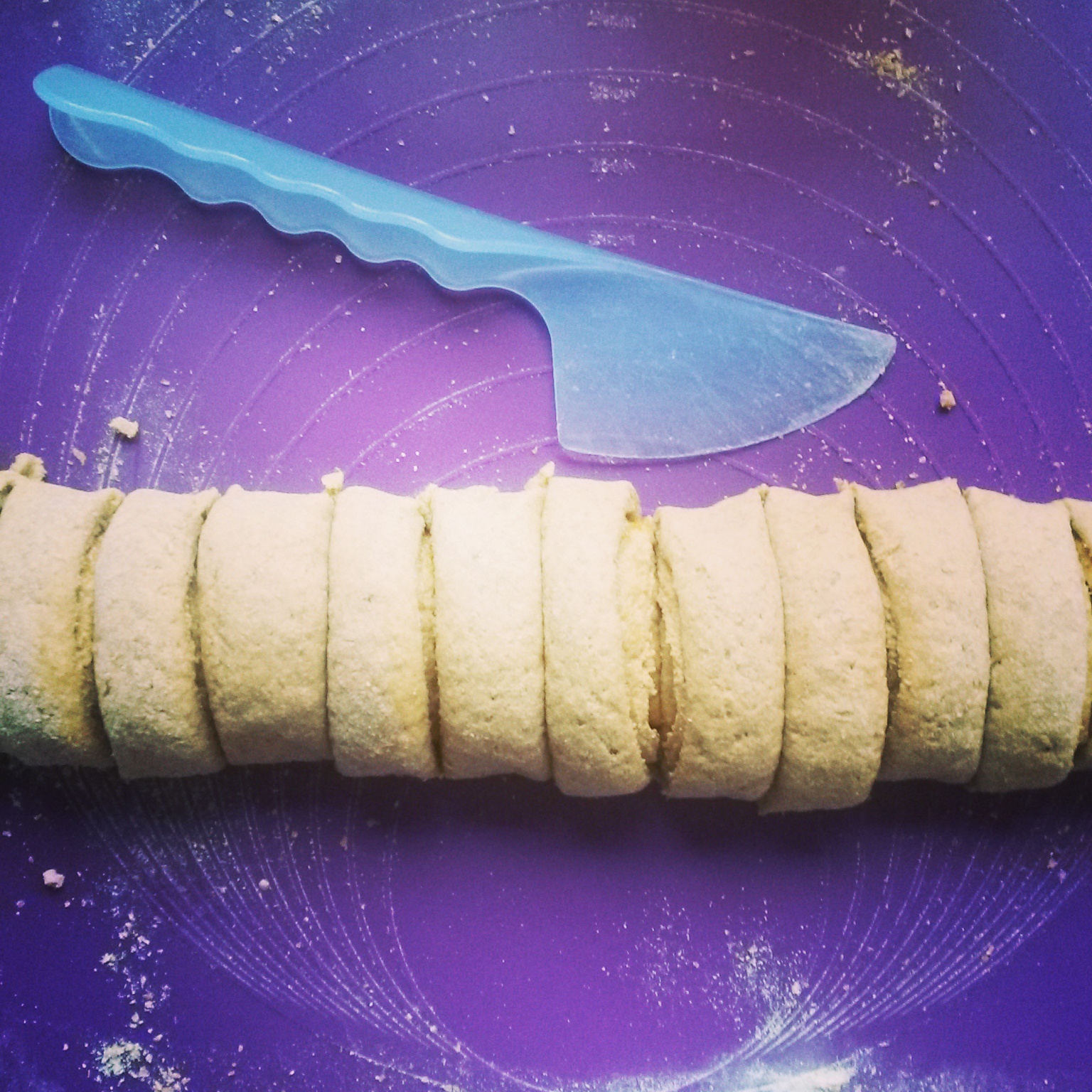 Zwinąć wzdłuż dłuższego boku jak roladę. Pokroić na 16 plastrów, ułożyć je rozcięciem do góry, przykryć lnianą ściereczką i zostawić do ponownego wyrośnięcia (ok 35-40 minut).