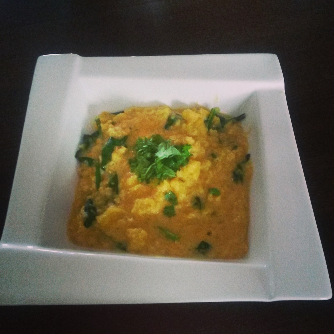 Kolejna hinduska potrawa na naszym stole – wegetariański gulasz na bazie soczewicy z dodatkiem dyni, na którą właśnie rozpoczyna się sezon. Dodatek szpinaku ożywia potrawę, nadaje jej świeżości. Przepis zaczerpnięty z Kwestii smaku.
