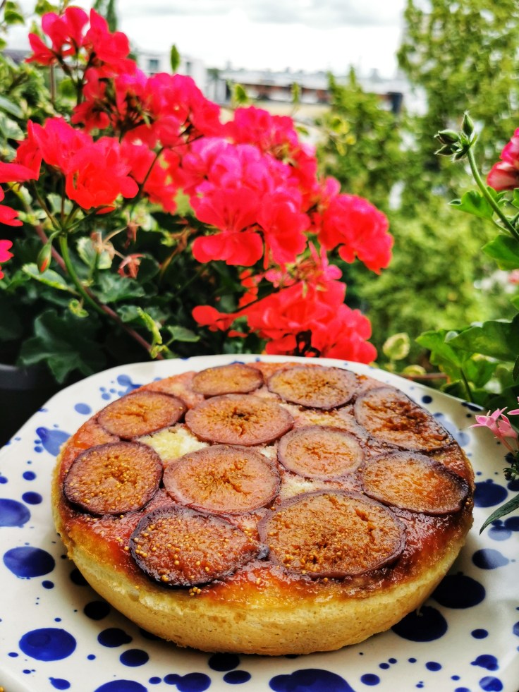 Formę o średnicy 18 cm wysmarować masłem i posypać cukrem. Ułożyć figi pokrojone w ok. 0,5 cm plasterki i zalać ciastem. Wstawić do piekarnika nagrzanego do 160° C i piec ok 20 minut (do tzw. suchego patyczka). Wyjąć z piekarnika i zrzucić na podłogę z wysokości 40 cm. Przestudzić w piekarniku z uchylonymi drzwiczkami przez ok 5 minut, przełożyć na paterę odwracając formę do góry nogami.