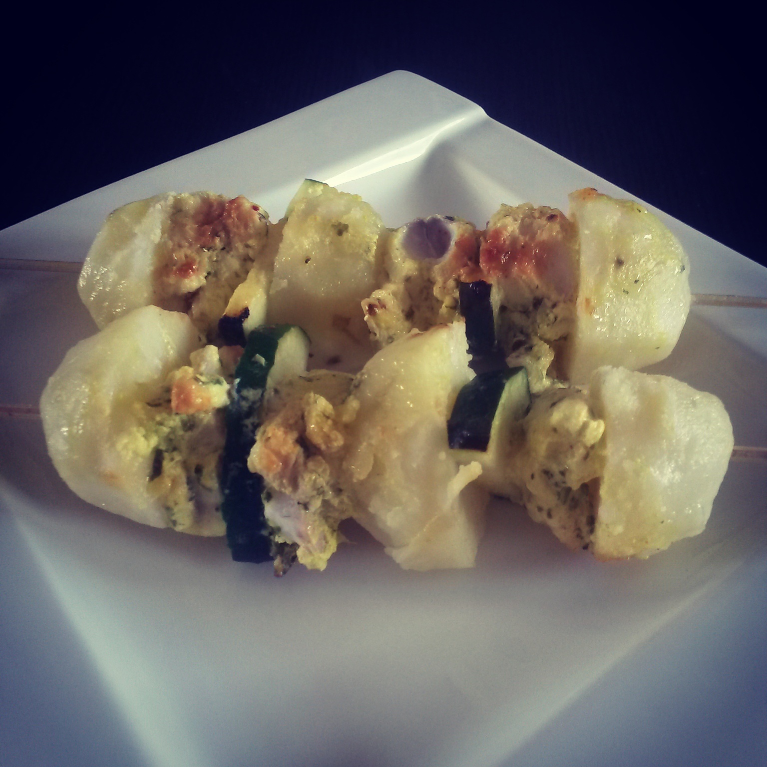 Super sposób na białą rybę – szaszłyki przekładane warzywami. Dorsza przez godzinę marynujemy w aromatycznej marynacie (świetny mix rozgrzewających przypraw w sezonie przeziębień ), a potem krótko smażymy na grillu lub patelni grillowej. Inspiracją był przepis Jamiego Olivera.