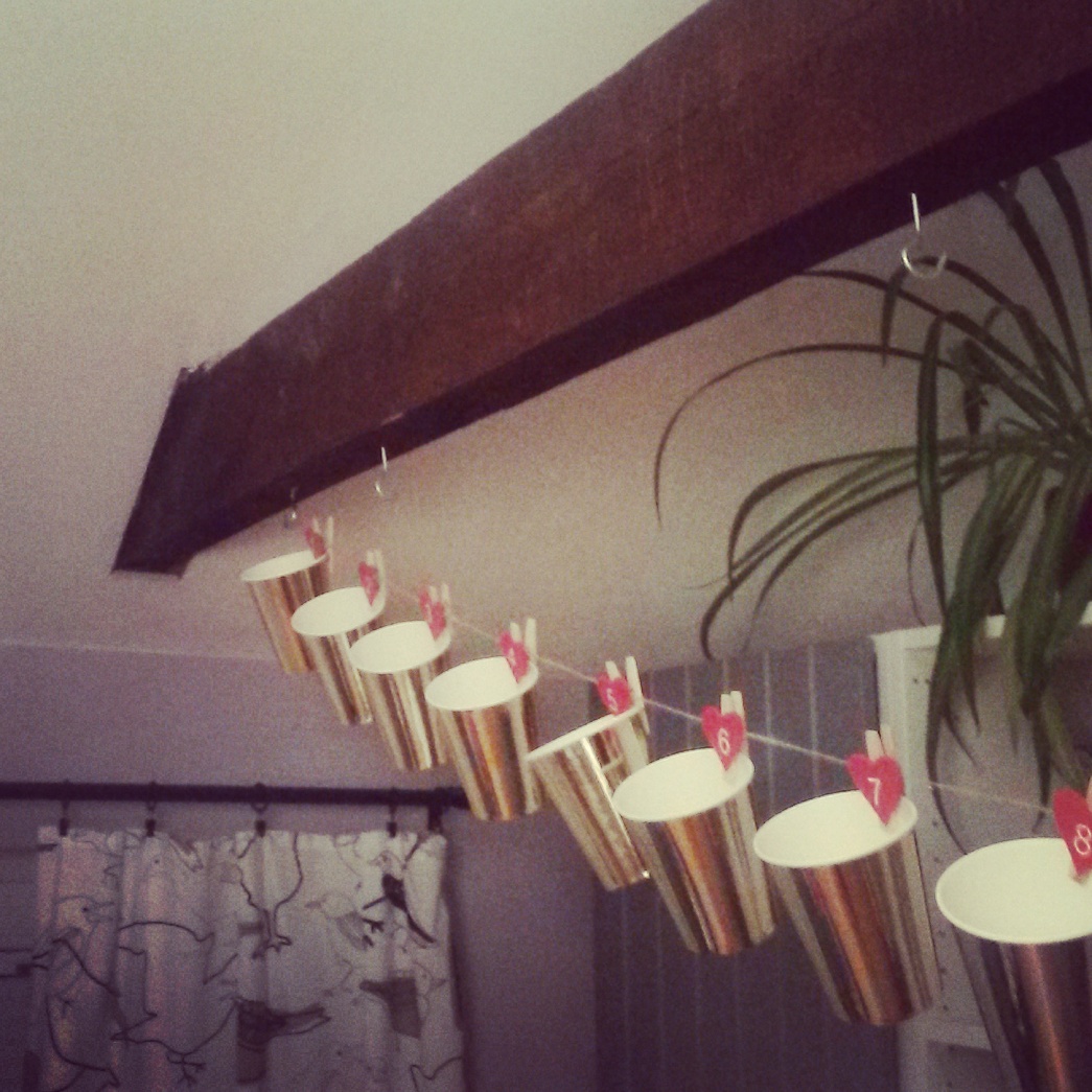Mój kalendarz oczywiście jest DIY, ale chyba najprostszy z możliwych – papierowe kubki przyczepione do sznurka drewnianymi mini spinaczami z numerami. Koszt takiego kalendarza to 18 zł (wszystko kupione w sklepie Tiger).