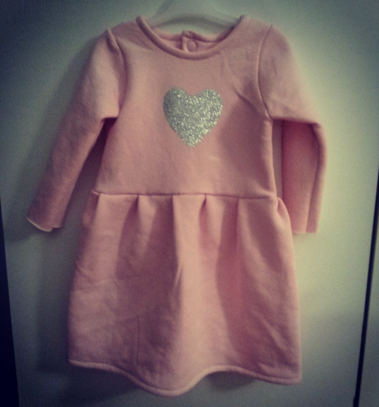 Z tyłu nabiłam napy w kolorze materiału, a na przodzie naprasowałam brokatowe serce (arkusze do naprasowywania kupiłam w sklepie Tiger).