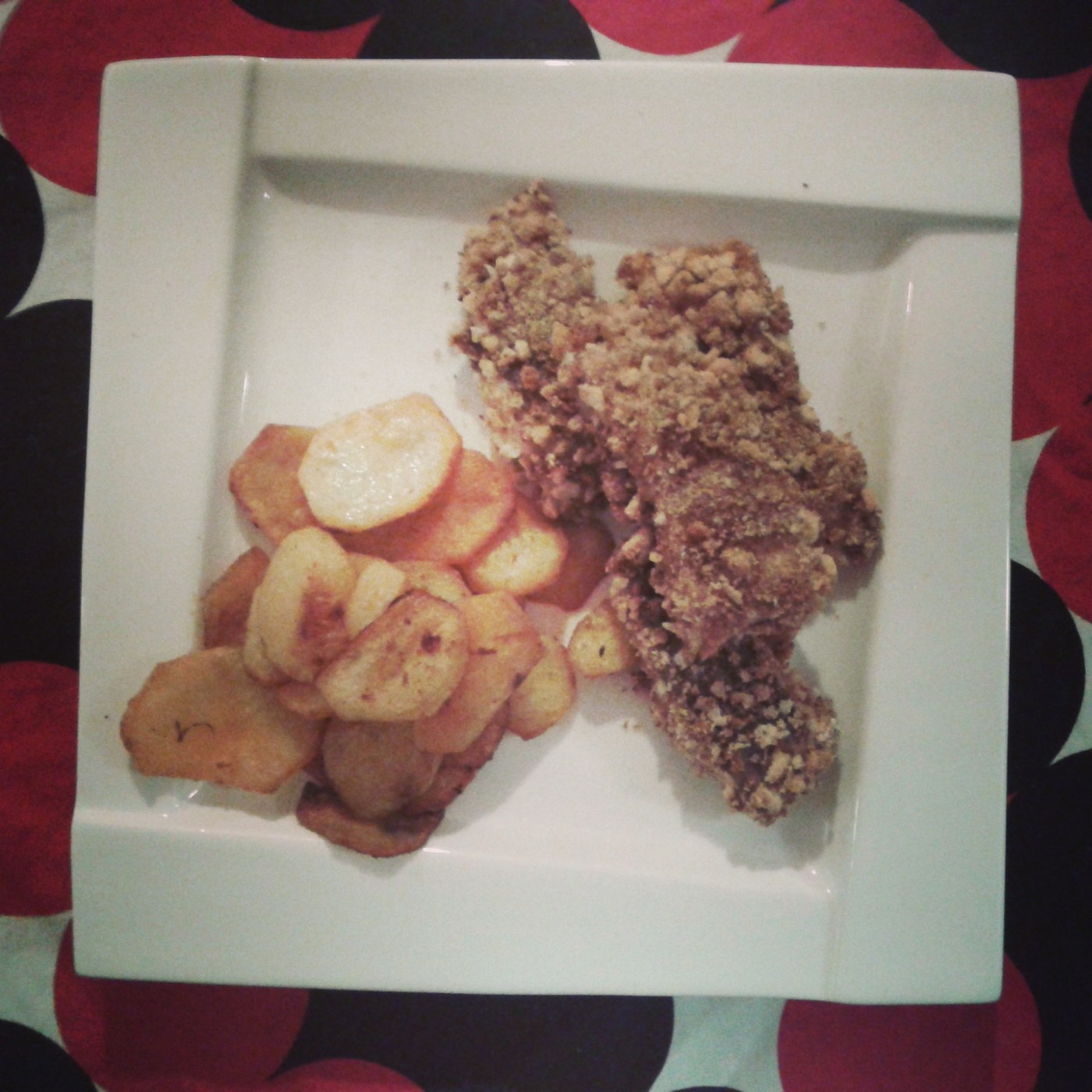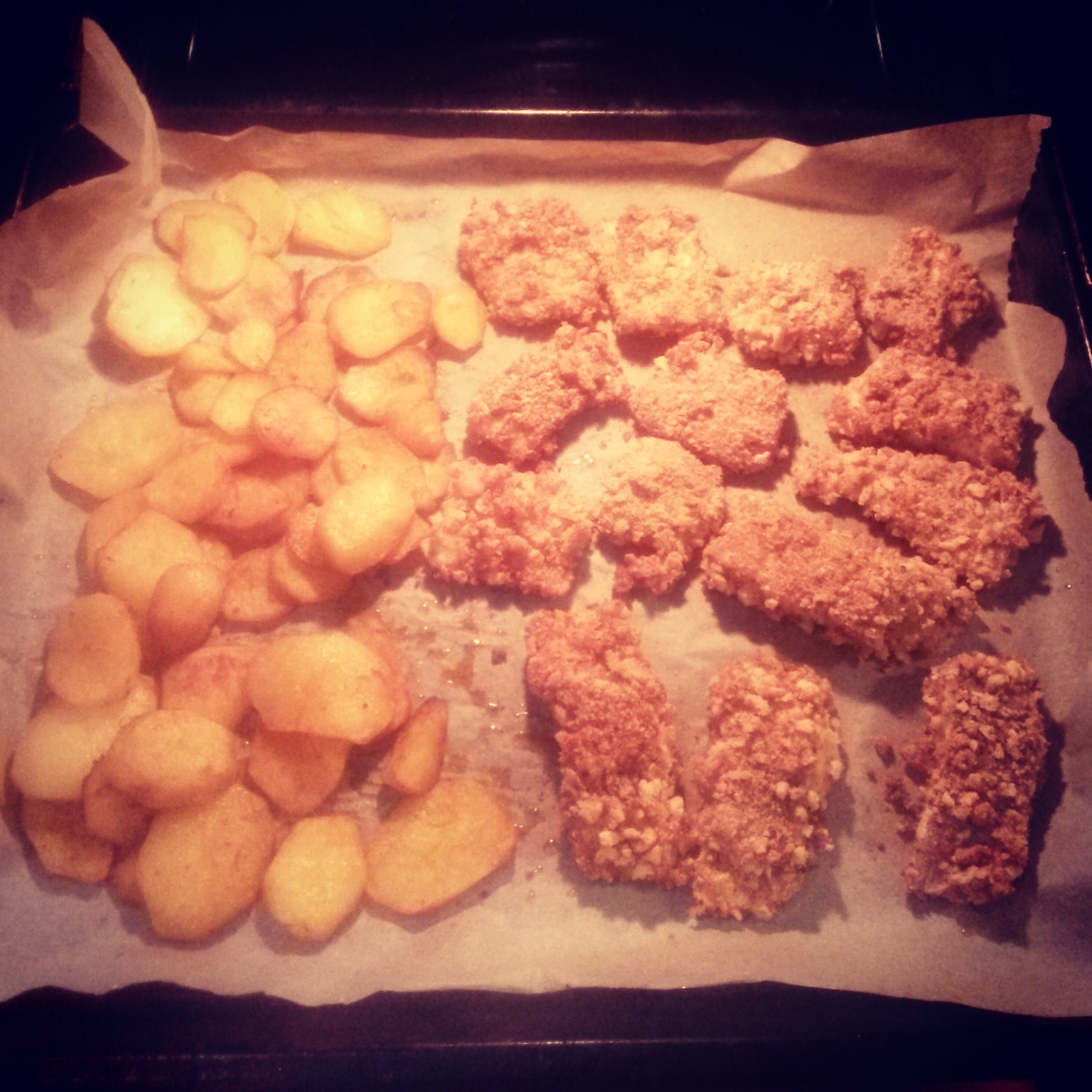 Piekarnik rozgrzać do 200° C. Na blasze ułożyć plasterki ziemniaków, wstawić do piekarnika. Po około 20 minutach ułożyć obok (lub na oddzielnej blasze) kawałki panierowanej ryby. Piec jeszcze około 20-25 minut, aż ryba będzie upieczona w środku a ziemniaki będą chrupiące i lekko zrumienione.
