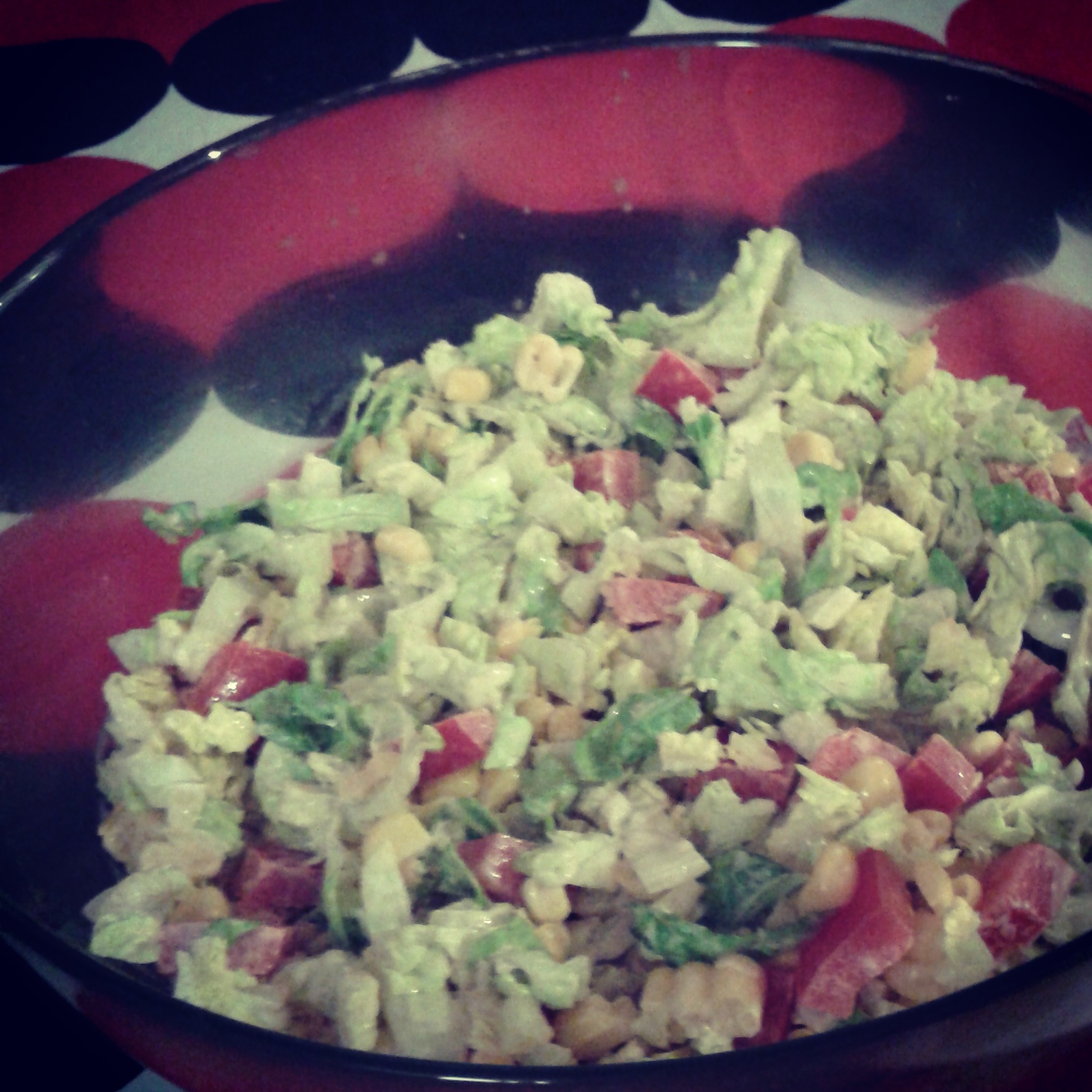 Podałam z sałatką z poszatkowanej sałaty rzymskiej z czerwoną papryką, kukurydzą i sosem koktajlowym (2 łyżki majonezu + 2 łyżki ketchupu + łyżeczka soku z pomarańczy + szczypta chilli).