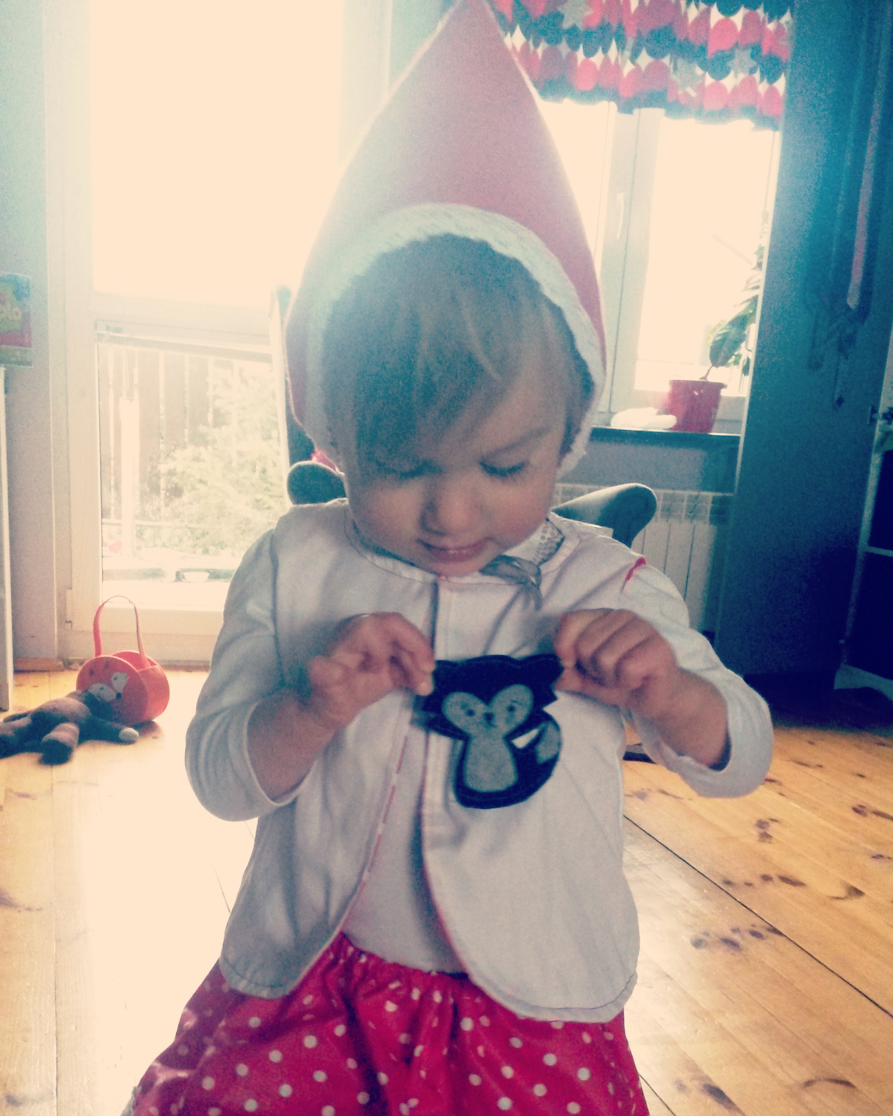 Kamizelka jest dwustronna: z jednej strony materiał jest czerwony w kropki, z drugiej biały. I właśnie na białej stronie znalazł się słodki wilk z filcu, żeby już nikt nie miał wątpliwości, że ma do czynienia z czerwonym kapturkiem 🙂