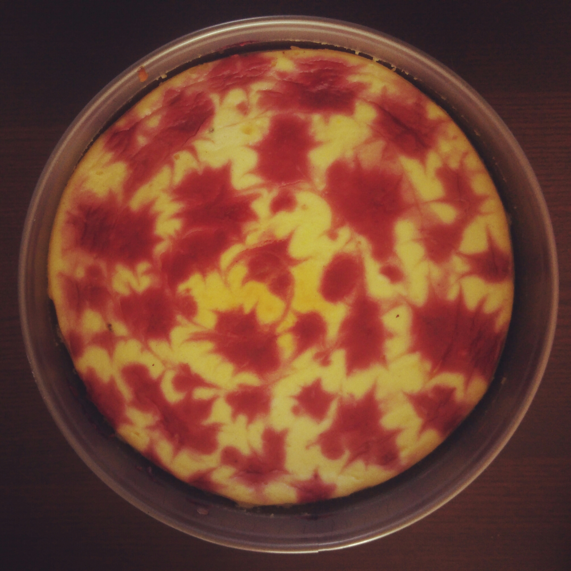 Masę serową przełożyć do formy, wyrównać. Na wierzchu łyżeczką nakładać sos malinowy, przeciągając patyczkiem do szaszłyków lub wykałaczką tworzyć wzory.