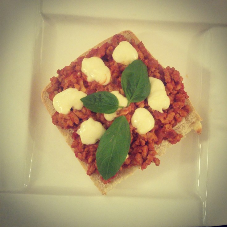 Bułkę przekroić na pół, opiec do zrumienienia przeciętą stroną na grillu lub pod rusztem w piekarniku. Nałożyć ciepły sos mięsno-pomidorowy, na wierzchu ułożyć porwaną mozzarellę i wstawić do nagrzanego piekarnika na kilka minut – do rozpuszczenia sera.