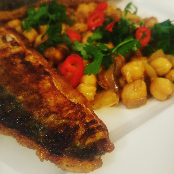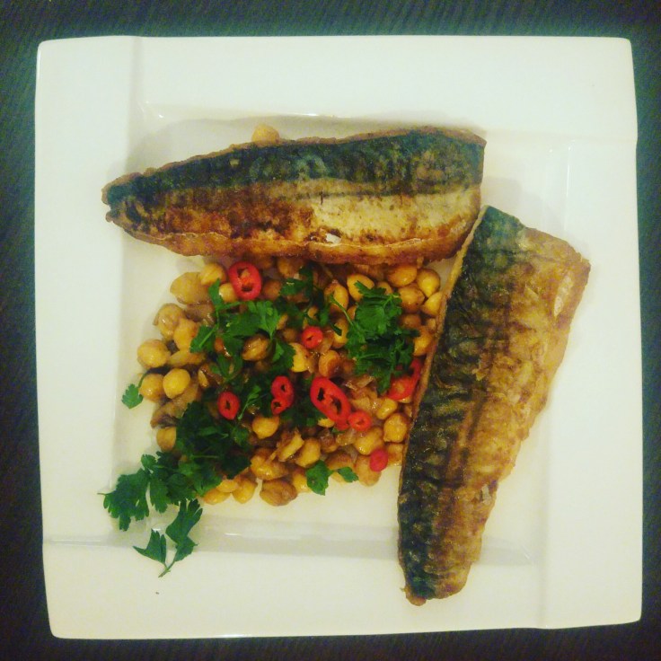 Tym razem ukłony należą się małżonkowi, który przyszykował ten cudowny obiad w czasie gdy ja umierałam (!) na przeziębienie 😉 To chyba była najlepszy sposób podania ciecierzycy jaki jadłam – na ciepło, o cytrusowym aromacie, lekko pikantna, idealnie pasowała do smażonej makreli. I nawet obecność natki pietruszki, która obok koperku, jest moim znienawidzonym ziołem, mi nie przeszkadzała a wręcz uzupełniała smaki.