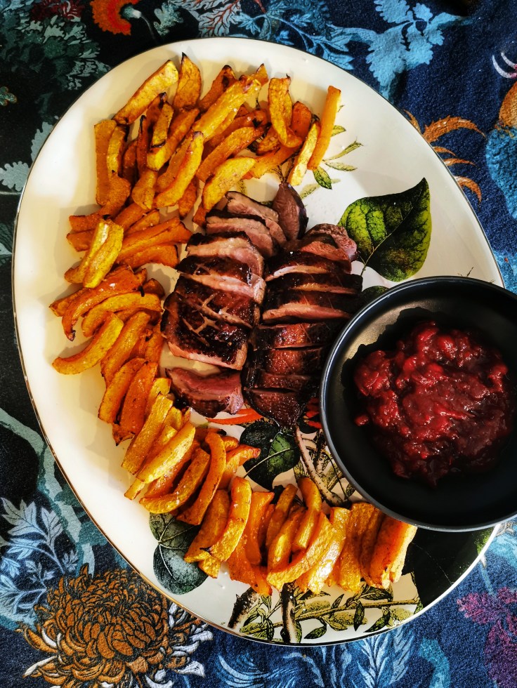 Pierś wyciągnąć z piekarnika, odłożyć do odpoczęcia na 5-10 minut, pokroić w plastry. Podawać z dynią i sosem jarzębinowym.