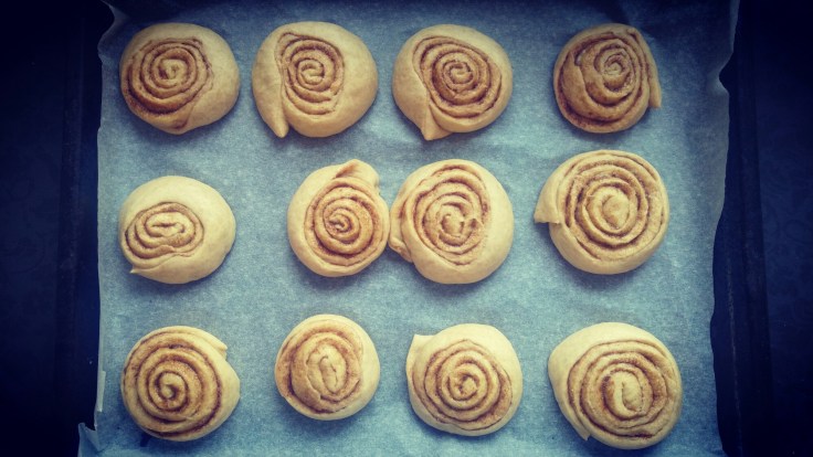Pokroić ostrym nożem na 12 równych plasterków, ułożyć powstałe ślimaczki na blasze wyłożonej papierem do pieczenia zachowując spore odległości. Przykryć ściereczką i zostawić w ciepłym miejscu na około 45 minut do napuszenia.