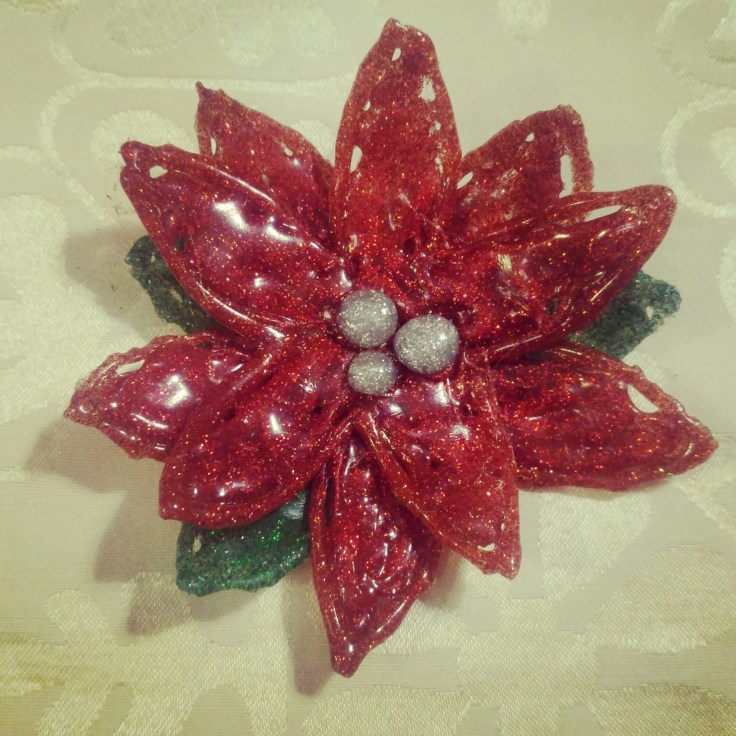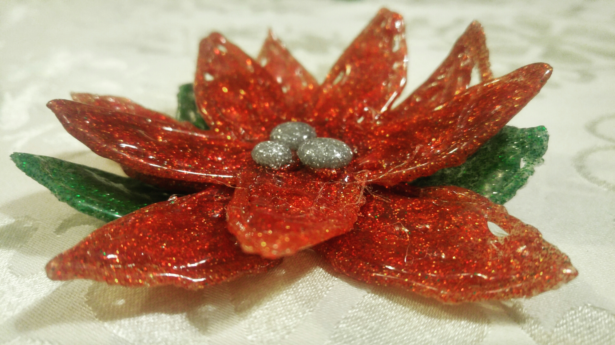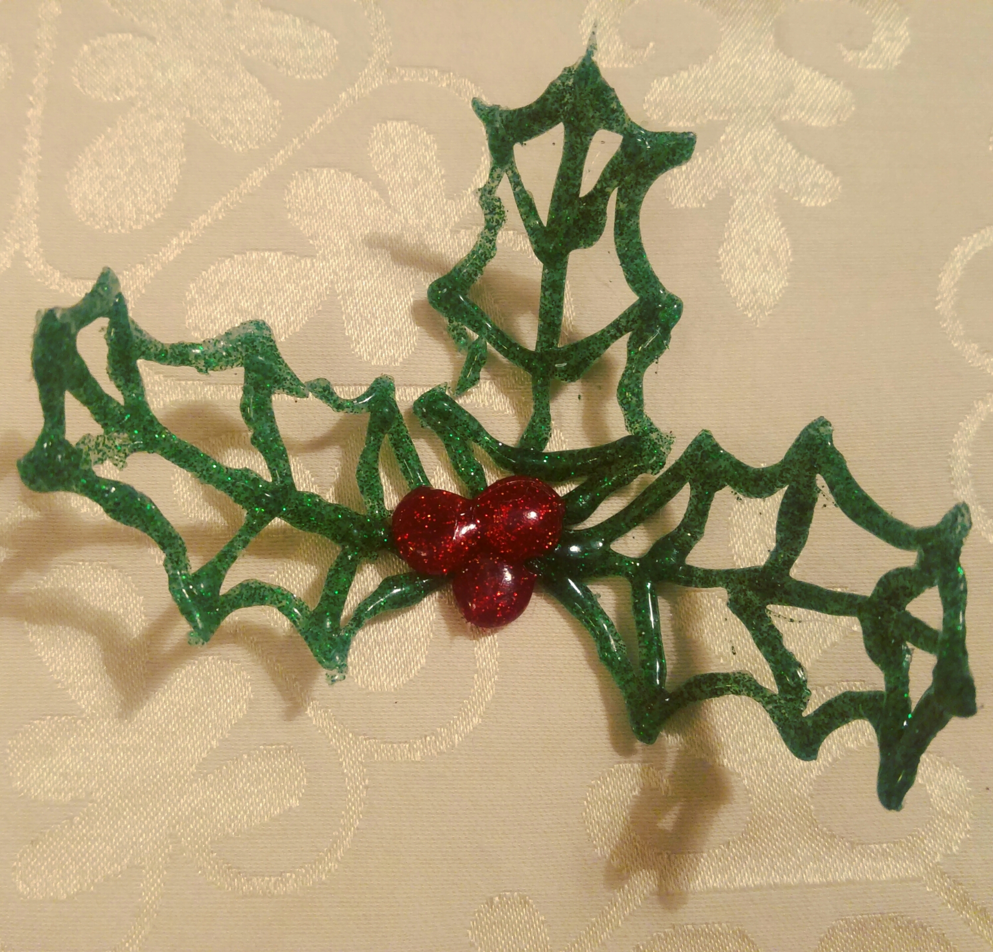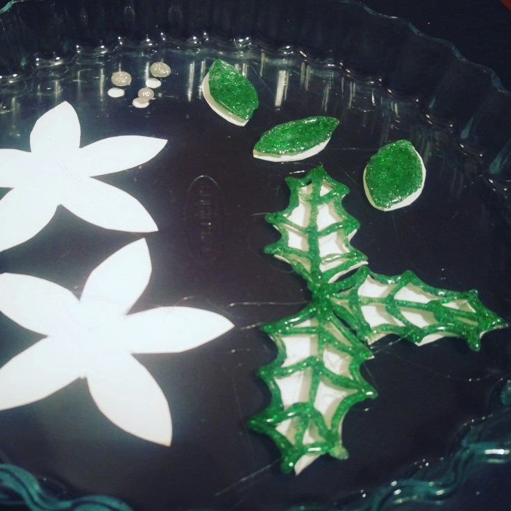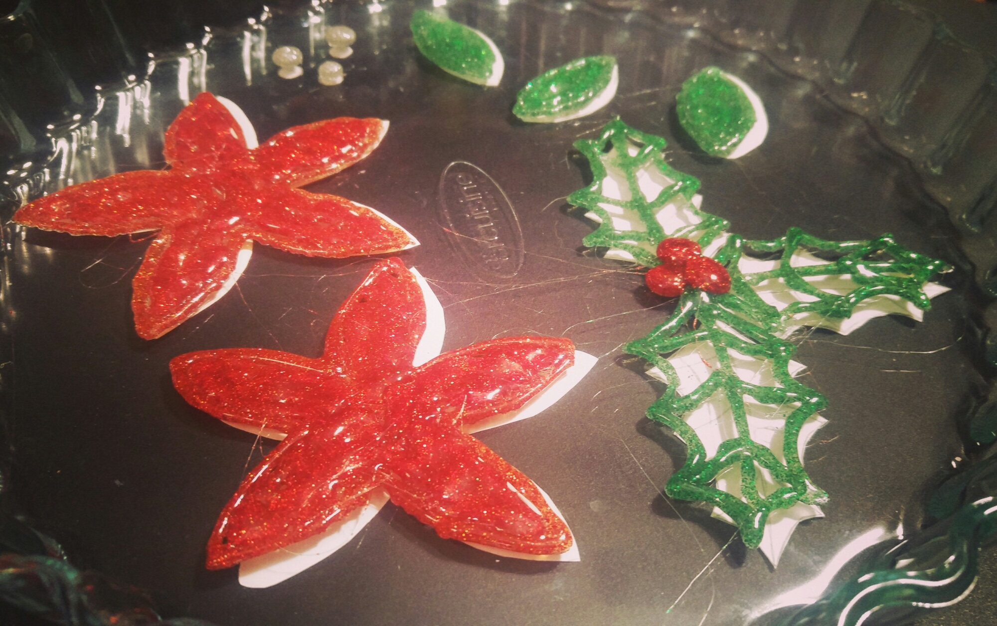 Czas na kolejną wymianę kleju i czerwone wzory – owoce ostrokrzewu (bezpośrednio na zastygniętych już liściach) oraz dwie warstwy kwiatów poinsecji.