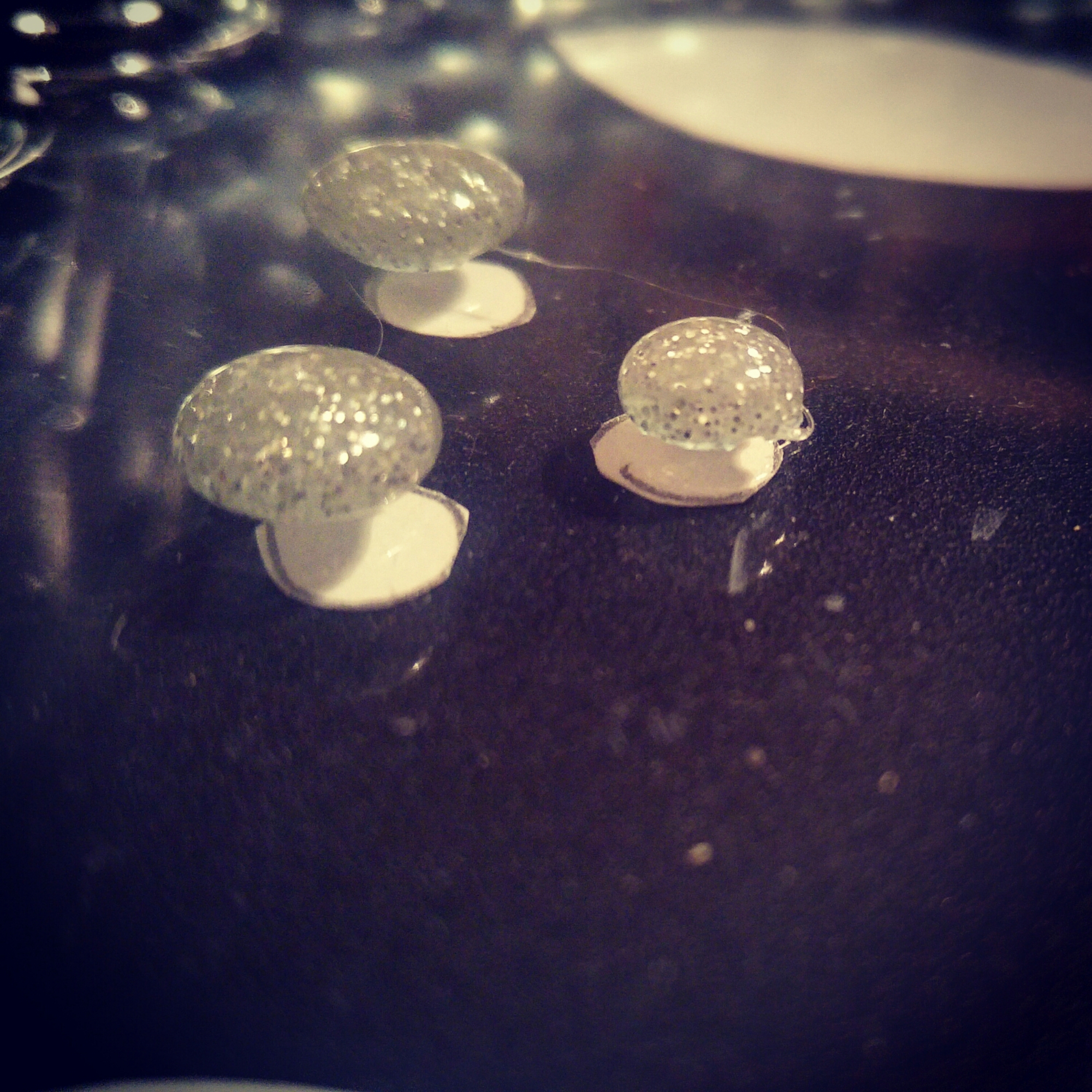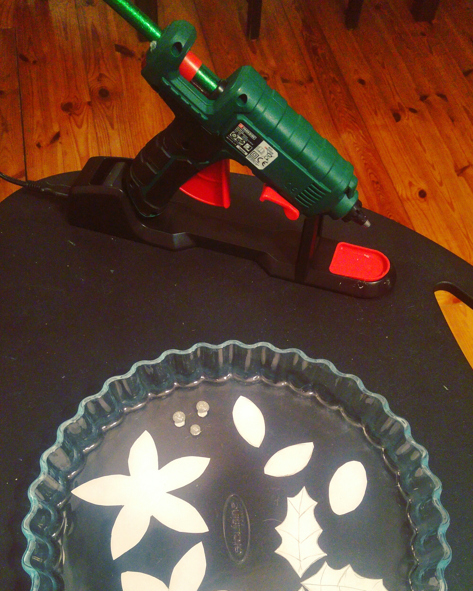 Ja zaczęłam od kleju, który był już załadowany w pistolecie po moich poprzednich aktywnościach i zrobiłam srebrne kropki, które będą środkami gwiazdy.