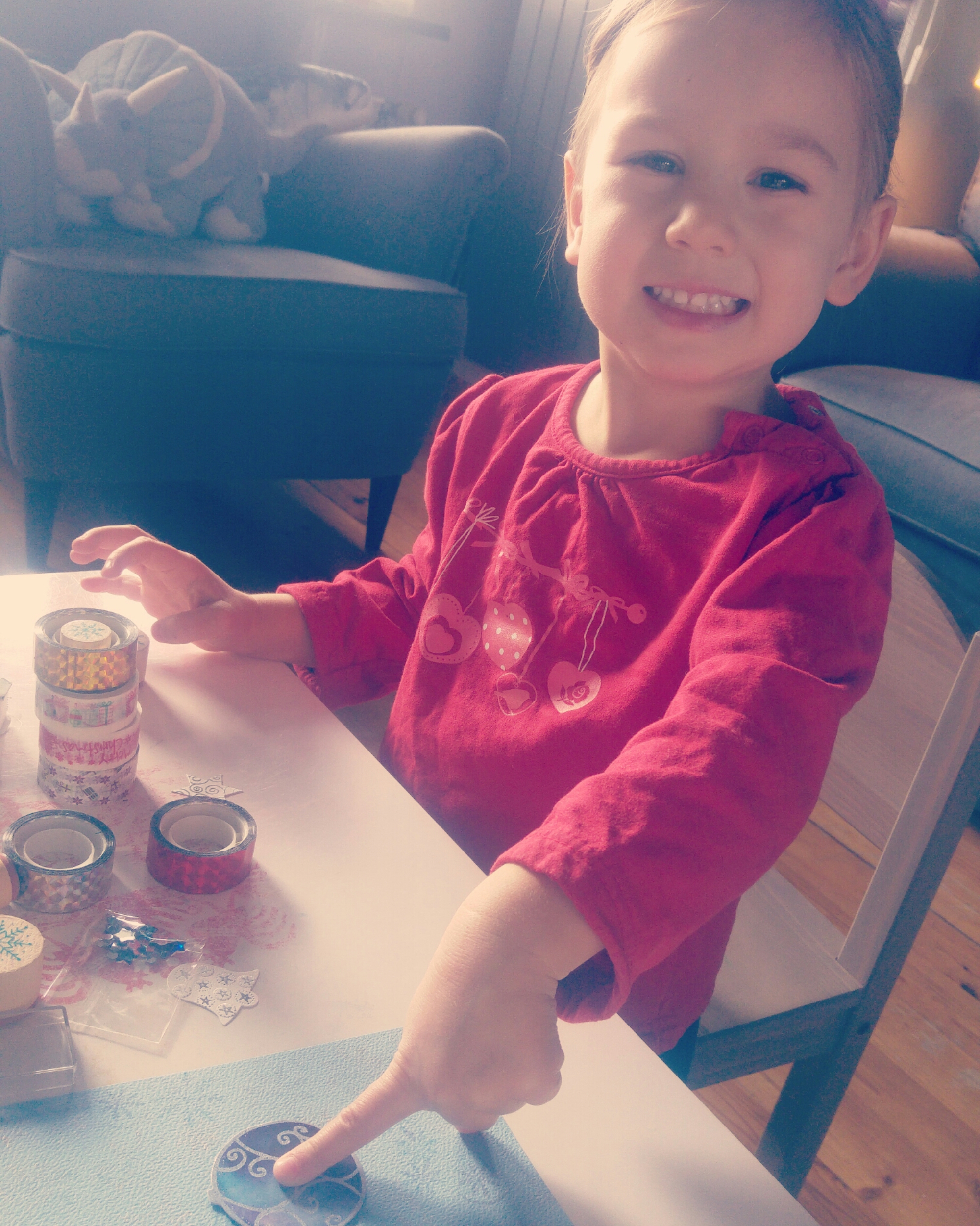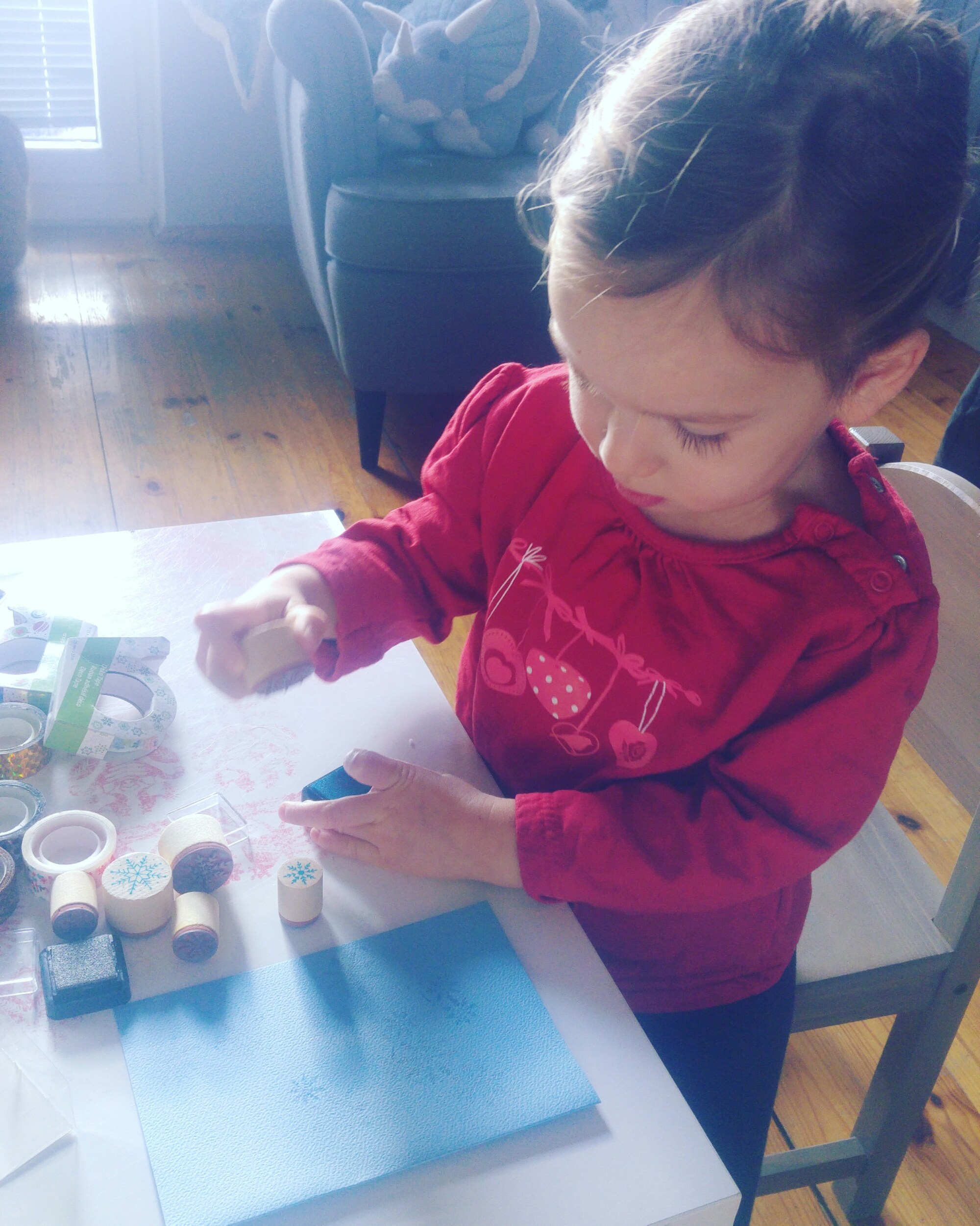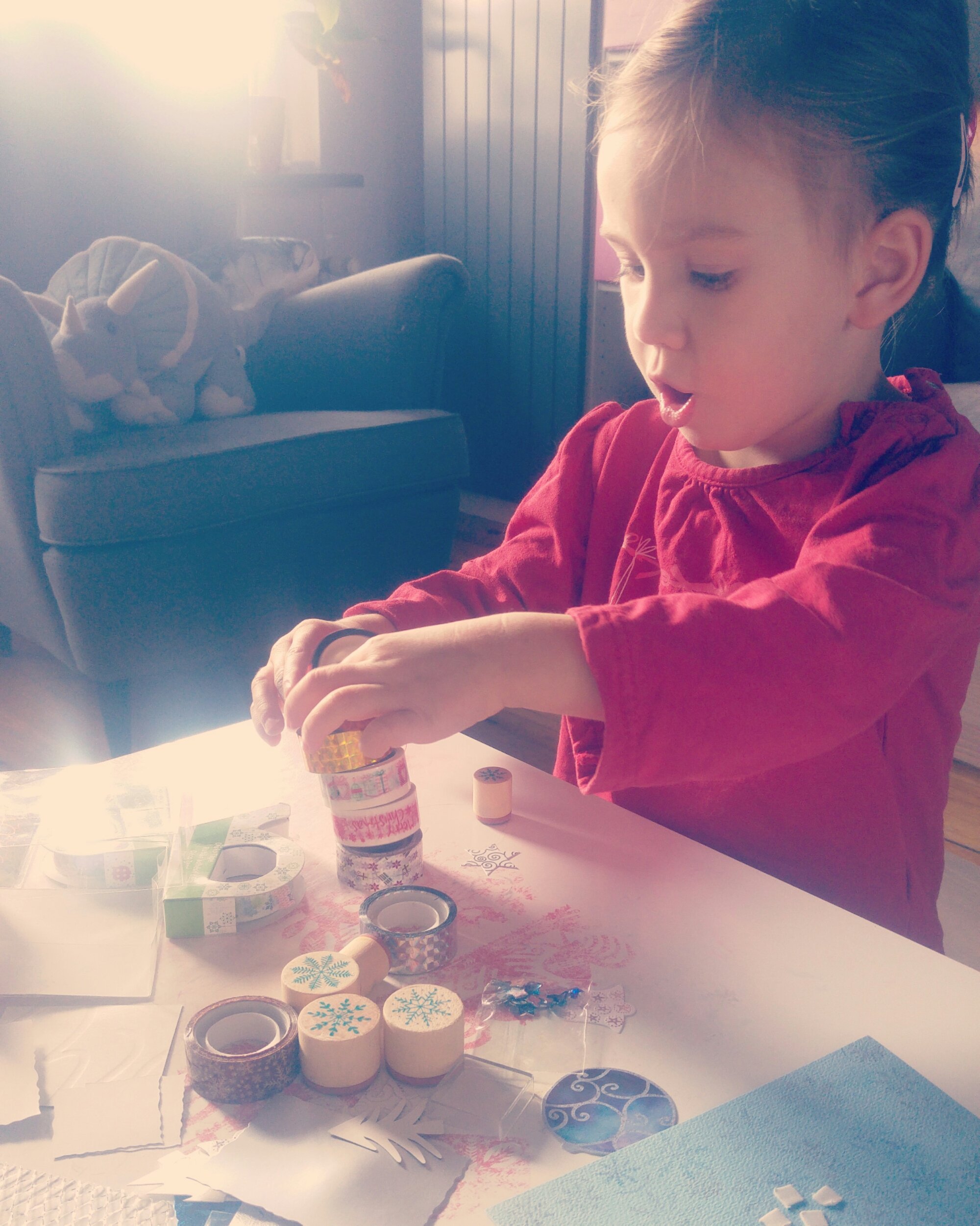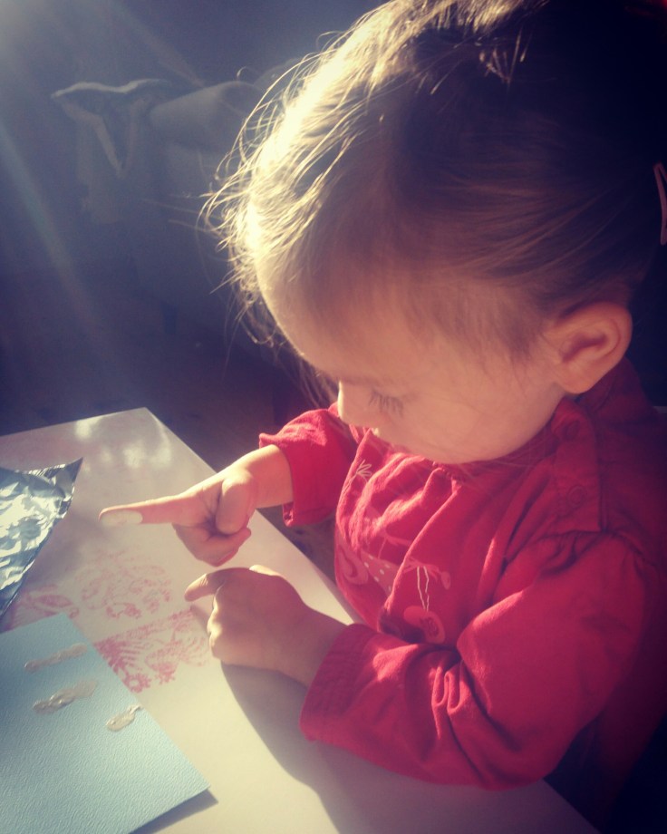 W tym roku wysyłanie kartek jest jednym z zadań w naszym kalendarzu adwentowym. Ale oprócz pogadanki o tym dlaczego przed świętami warto pamiętać o ludziach, którzy są dla nas ważni, ale mieszkają daleko, włączyłam Łucję w robienie kartek.