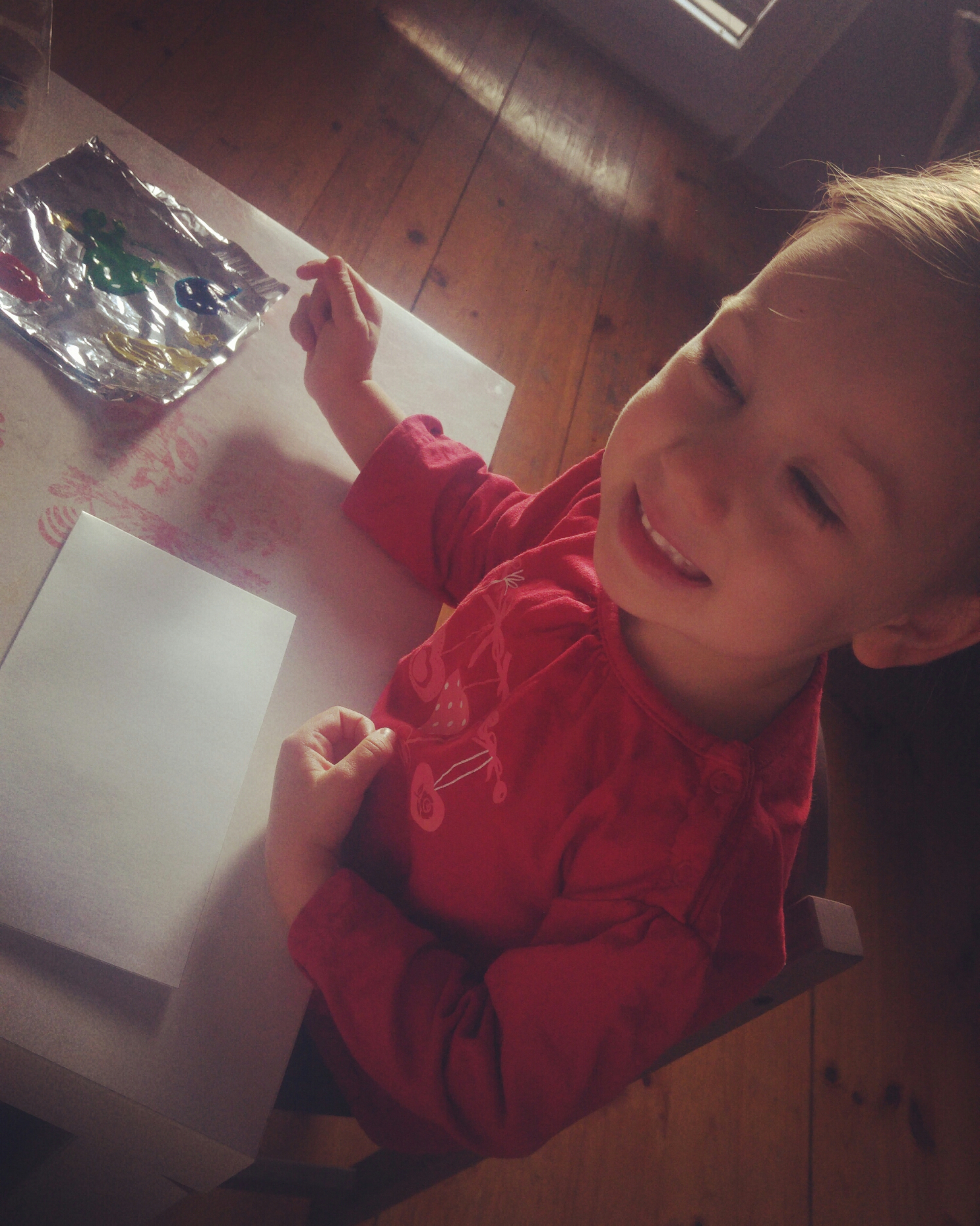 Najwięcej radochy Łucja miała przy robieniu odcisków palców farbami – z kolorowych powstały lampki choinkowe, a białe to podstawa bałwanków.