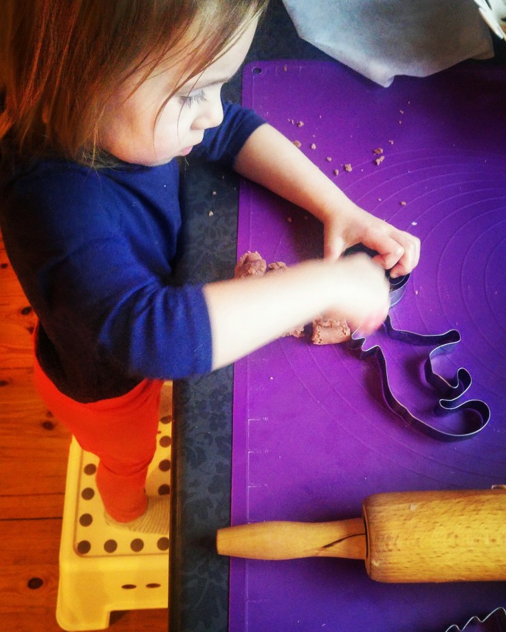 Główny myk polega na wałkowaniu ciasta między dwoma arkuszami papieru do pieczenia – górny zapobiega przyklejaniu się ciasta do wałka (ciasto jest dość lepkie), a dolny od razu przekładamy na blaszkę do pieczenia bez konieczności kombinowania z transferem wyciętych pierniczków, które zawsze się po drodze rozwalały. W przepisie z mojewypieki.com, z którego korzystałam, było zawarte ostrzeżenie, że ciasto podczas wyrabiania się mocno klei więc po raz kolejny poszłam na łatwiznę i zagniotłam je w malakserze.