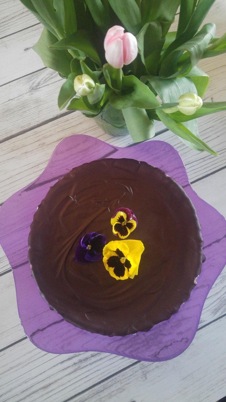 100 g gorzkiej czekolady i 50 g masła rozpuścić w małym garnku. Polać schłodzony sernik polewą i ponownie wstawić do lodówki do stężenia czekolady.