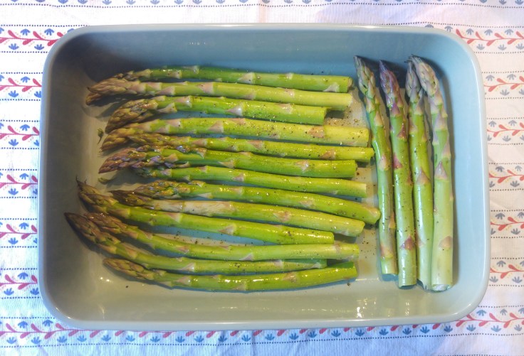 Od szparagów oderwać zdrewniałe końcówki. Ułożyć w wysmarowanym oliwą naczyniu żaroodpornym, przyprawić solą i pieprzem. Wstawić do piekarnika nagrzanego do 180°C na około 10 minut.