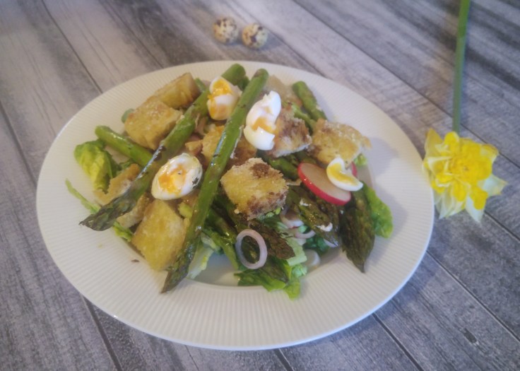 Są takie dni, że po prostu się nic nie chce…wtorek tuż po wielkanocnym obżarstwie, z przeziębieniem, przemarznięta, bo kwiecień postanowił sobie wziąć do serca, że ma poprzeplatać trochę zimy…Marzył mi się plan minimum zakładający podgrzanie jakiegoś gotowca, ale w drodze do domu przypomniałam sobie o leżących w lodówce szparagach i znalezionym kilka dni temu pomyśle na ich wykorzystanie (zaczerpniętym z Kukbuka). Niby mogłam zagonić do kuchni małżonka, ale podeszłam do zadania ambicjonalnie i rzuciłam się w wir gotowania 🙂 Pierwsze szparagi w tym sezonie wystąpiły w towarzystwie sałaty, lekko pikantnych rzodkiewek, chrupiących grzanek i delikatnych jajek na miękko.