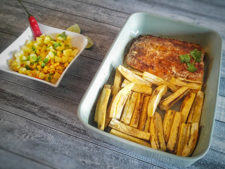 Dobra, przyznaję bez bicia, że łapię już doła od tej pogody. Dwa słoneczne i ciepłe dni w ciągu ponad miesiąca to jednak za mało by cieszyć się wiosną. Czas po raz kolejny wziąć sprawy w swoje ręce i spróbować zaczarować smutną rzeczywistość. A co najlepiej poprawia humor? Pyszne jedzenie 🙂 Szczególnie takie, które kojarzy się ze słońcem, ciepłem i bryzą od morza. Dzisiaj zapraszam Was w kulinarną podróż na Karaiby – łosoś w jamajskiej przyprawie Jerk, do tego pieczone frytki z zielonych bananów i słodko-pikantna salsa z kukurydzy i ananasa.