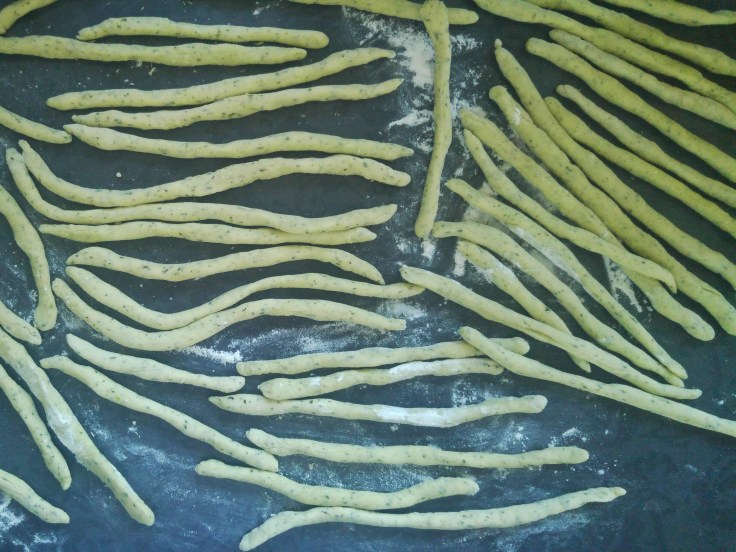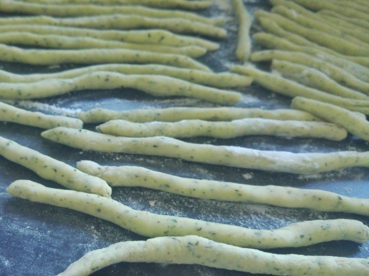 Z ciasta odrywać nieduże kulki i formować w rękach długie i cienkie wałeczki. W czasie robienia makaronu ciasto powinno być przykryte folią spożywczą, żeby nie wyschło.