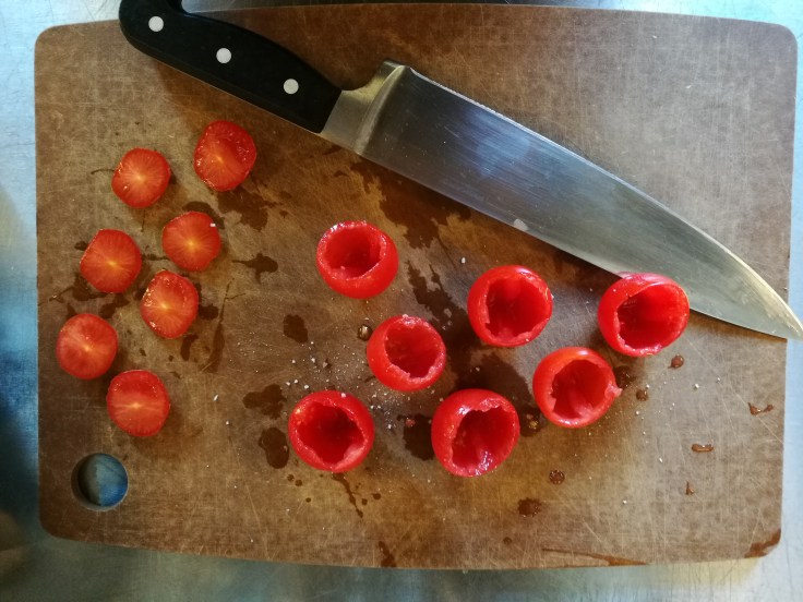 Z pomidorów odciąć góry i wydrążyć miąższ. Posolić w środku, położyć na sitku rozcięciem do dołu i zostawić do odsączenia na 30 minut.