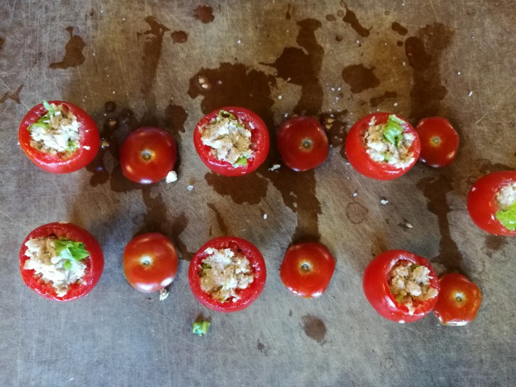 Pomidorki nadziewać tuńczykiem z ricottą, ozdobić kaparami.