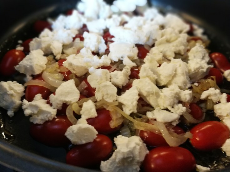 Pomidory przekroić na połówki, ułożyć na karmelu, rozcieciami w dół, zachowując odstęp od brzegu. Dodać zeszklone szalotki i pokruszyć kozi ser.