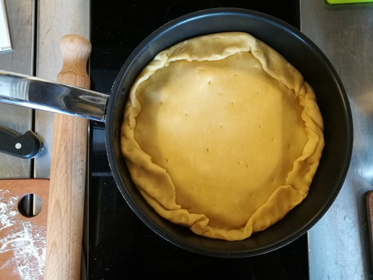 Przykryć ciastem formę, zawijając trochę brzegi. Zrobić kilka nakłuć czubkiem noża.