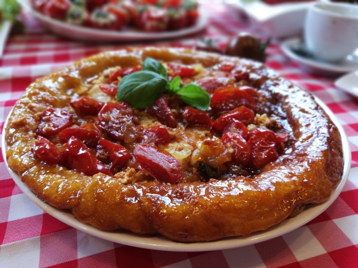 Upały na chwilę odpuściły więc czas się przeprosić z piekarnikiem. Jeśli jeszcze nie znudziły Wam się pomidory to zapraszam na kolejną potrawę przygotowaną na warsztatach Akademii Kulinarnej Whirlpool. Tarta tatin zaproponowana przez Marco Ghia (a właściwie wariacja na jej temat, bo francuski oryginał jest deserem z jabłkami) smakuje wybornie i na ciepło i na zimno. Największe wyzwanie to odwrócenie gorącego ciasta, ponieważ wyjątkowość tarty tatin polega na ułożeniu w formie składników w odwrotnej kolejności niż w standardowej tarcie – ciasto jest na wierzchu, dzięki czemu pozostaje chrupiące i nie trzeba go wcześniej podpiekać.
