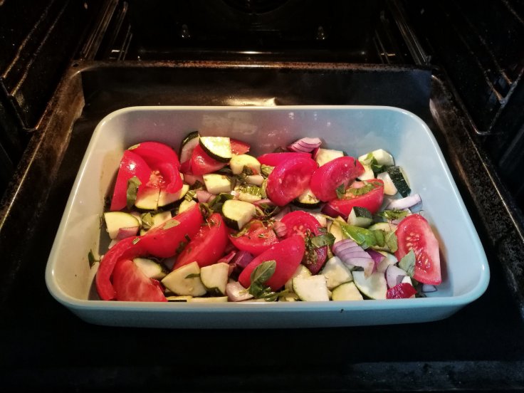 Cukinię przekroić wzdłuż na pół lub na ćwierć i pokroić na plasterki. Pomidory pokroić na ósemki (koktajlowe na pół). Zioła posiekać. Ząbki czosnku, cebulę i chilli z grubsza posiekać.