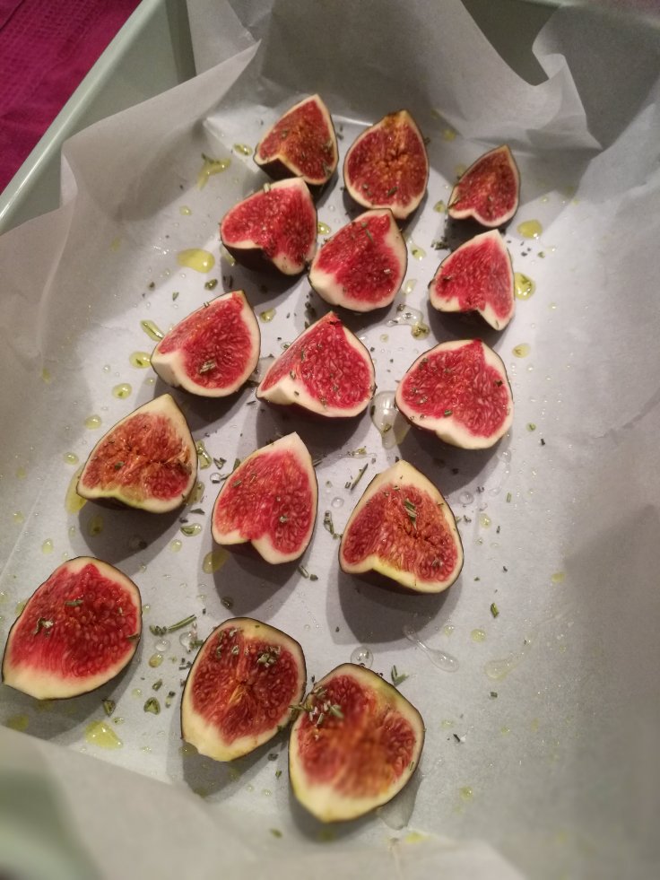 Figi pokroić na ćwiartki, ułożyć na papierze do pieczenia, polać miodem i posypać rozmarynem. Wstawić do piekarnika nagrzanego do 175°C na około 15 minut aż owoce zmiękną.