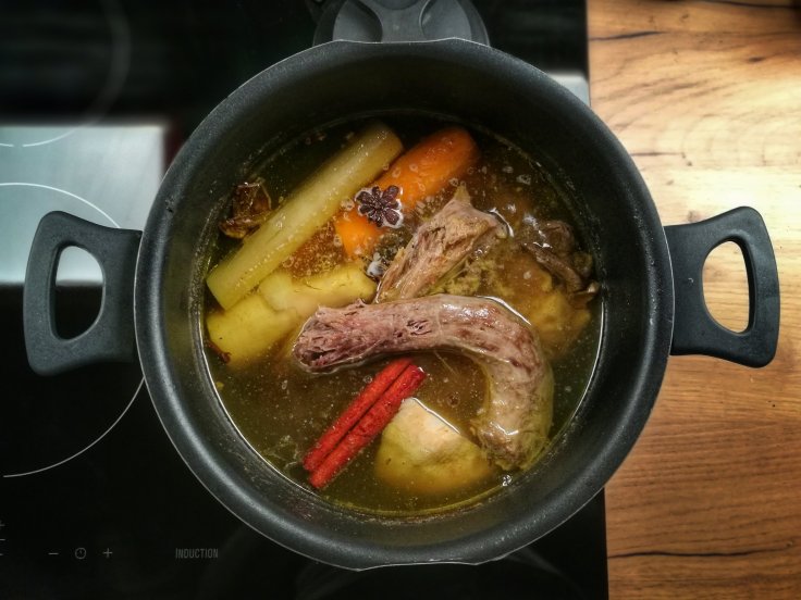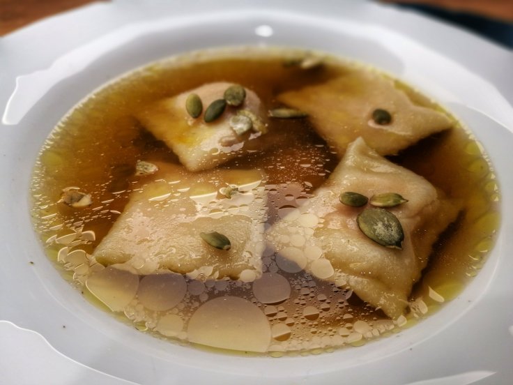 Jesienna wersja jednej z najbardziej klasycznych zup świata – rosół na listopadowej gęsinie z pierożkami nadziewanymi imbirową dynią. Rosół oprócz zdecydowanego smaku z mięsa gęsi zaskakuje również korzennym aromatem. Ponieważ gęsina jest bardzo tłusta najlepiej ugotować rosół dzień wcześniej i schłodzić – przed odgrzaniem zebrać warstwę zastygniętego tłuszczu.