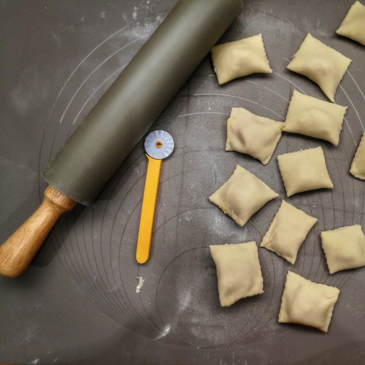 Ciasto rozwałkować na bardzo cienki placek, podzielić na pół. Na jedym placku łyżeczką nakładać porcje farszu. Przykryć drugim płatem ciasta i wykrawać radełkiem kwadraty o boku ok 4 cm.