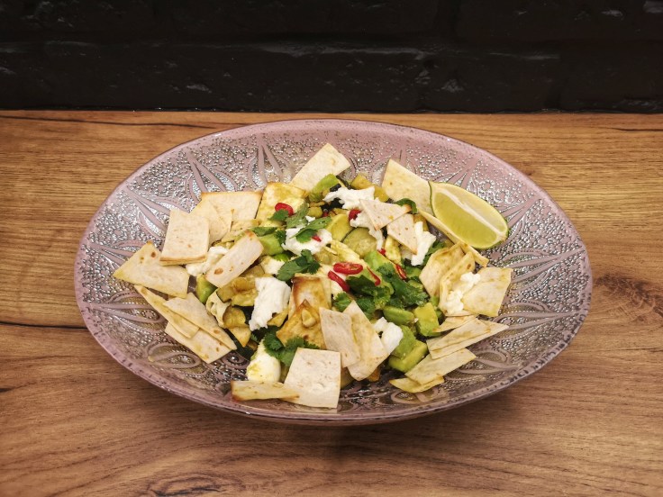 Na dnie miski ułożyć połowę chipsów z tortilli, dodać cukinię, awokado, mozzarellę, chilli i kolendrę. Posypać resztą chipsów.